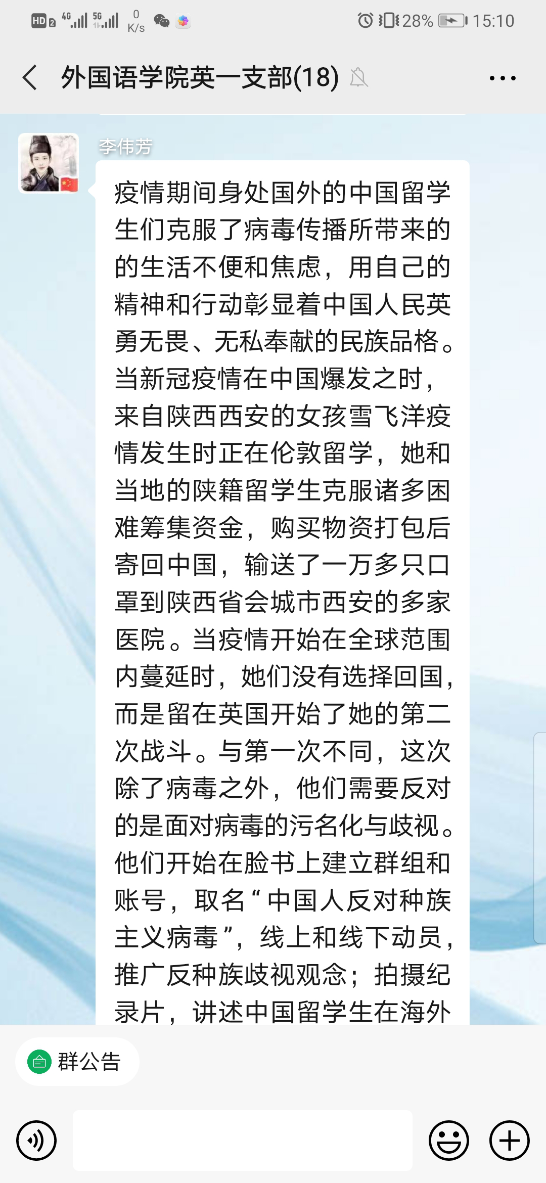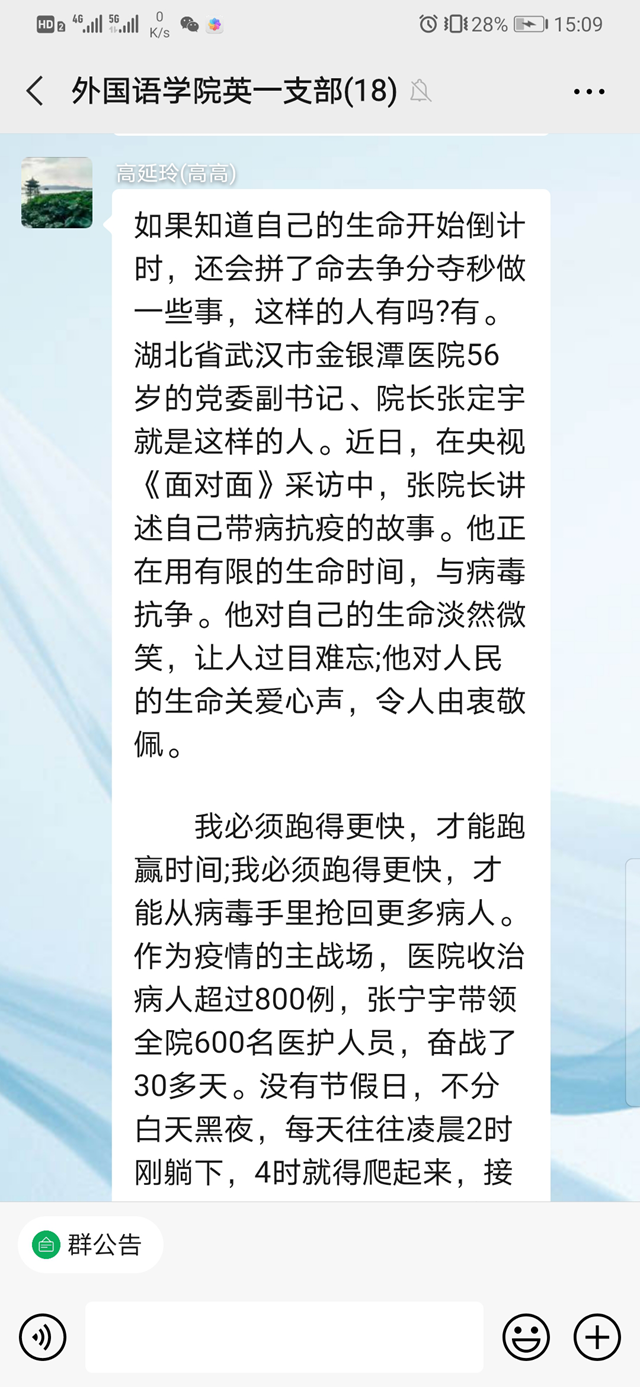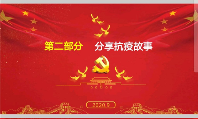 在会议的最后,党员教师积极踊跃发言,分享了自己所知道的战疫故事。其中,李伟芳老师讲到,新冠肺炎疫情在全球的肆虐,使我们更清楚地认识到在当今全球化时代,战胜疫情是所有人共同的责任。在这场空前绝后的战疫中,中国共产党领导的中国政府采取有力的防控措施遏制疫情蔓延势头,同时推动复工复产有序进行。中国共产党领导下的中国政府和中国人民在此次战疫中展现的能力、意志、决心与担当令世界动容。马珂老师就投身武汉抗疫工作的党员朱海秀的事迹发表了自己的感想:“我们相信在党中央的坚强领导和全国人民的共同努力下,没有任何困难能够打败中国人民,我们必将取得这场疫情战的最后胜利。”