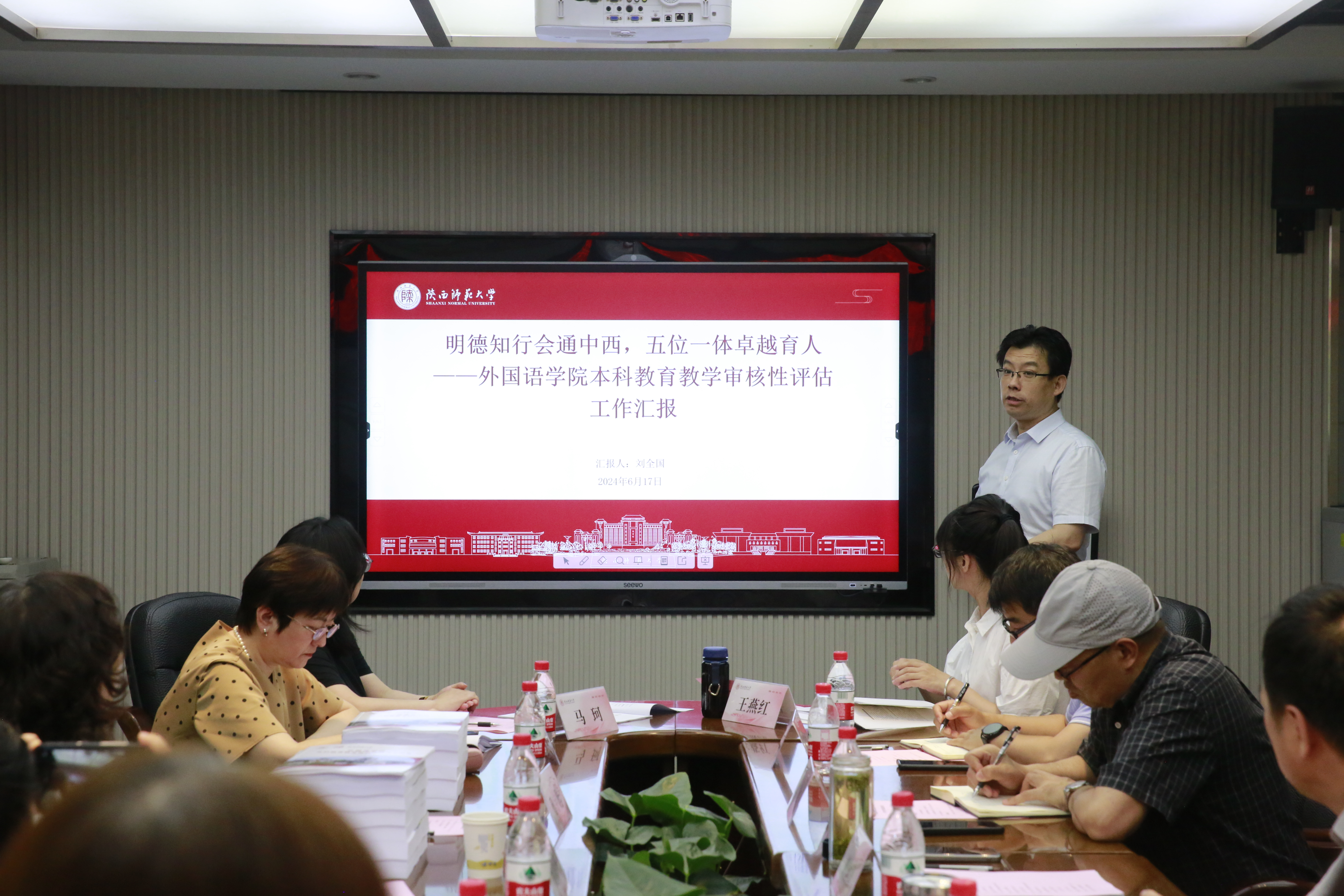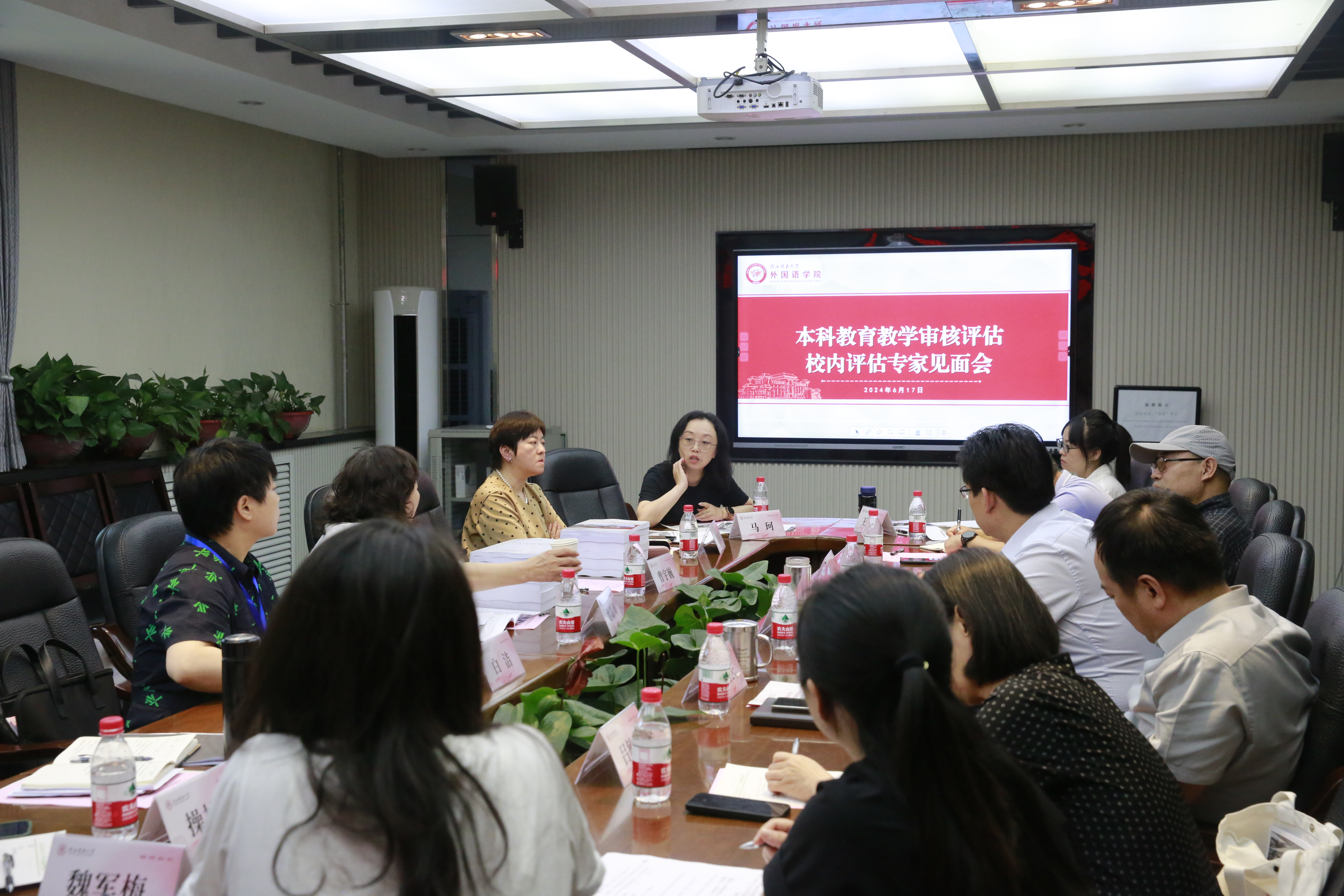 6月17日下午14:00,best365正规在雁塔校区教学六楼会议室召开本科公司产品审核评估校内评估专家见面会。本次会议由评估专家姚聪莉教授主持,参会成员有:教务处曹宇巍副处长、专家联络员白洁、best365经理刘全国、党委书记董增云、教学副经理孙坚、党委副书记鲁燕、研究生副经理吕敏宏、科研副经理兼日语系主任曹婷、行政副经理王幸生、督导委员会主任魏军梅、俄语系主任孟霞、公共外语教学与研究部主任马珂、英语系主任杨冬敏、翻译系主任操林英、法语系主任王燕红、团委书记李丹、办公室主任王莉、语言智慧教学中心主任邢俊升、公共外语教学秘书王维隽和本科专业教学秘书高红英。