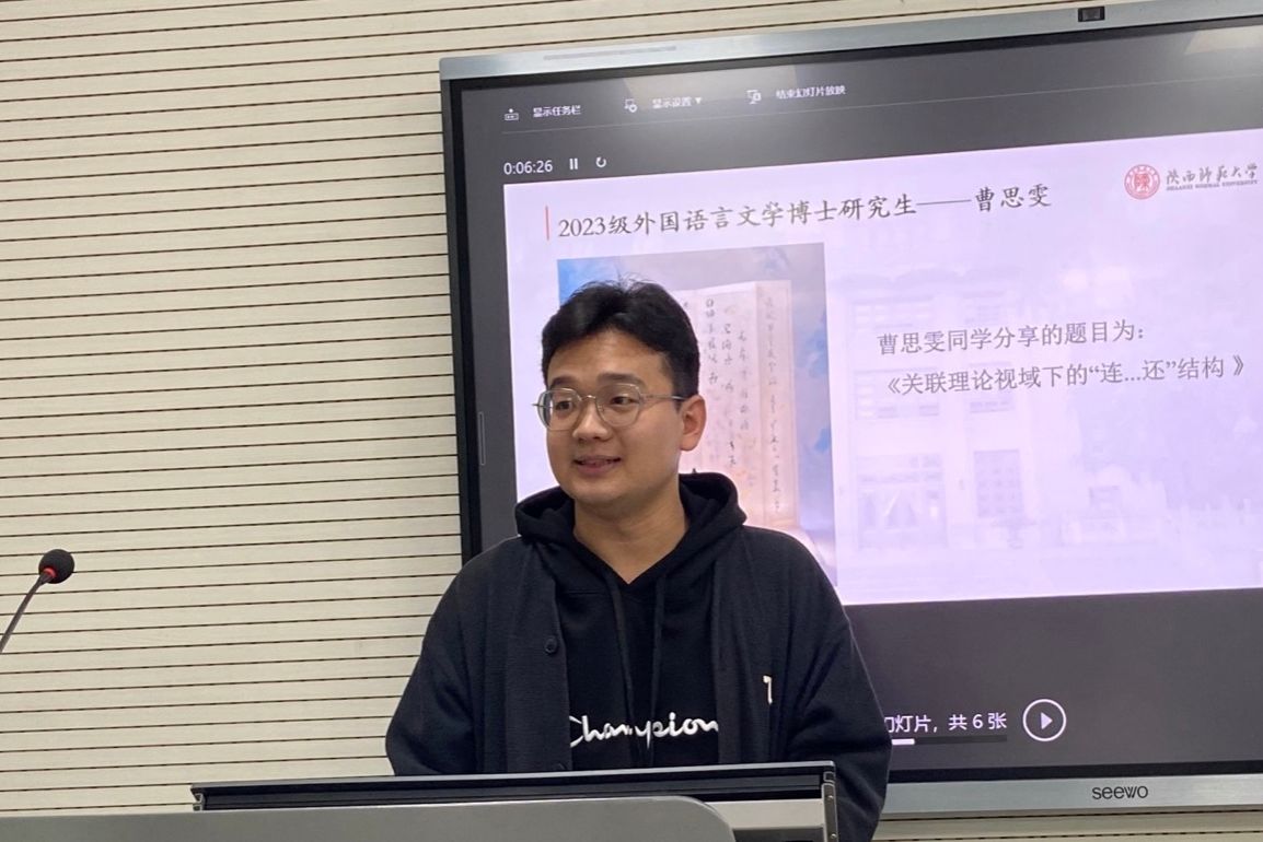 为营造良好学术氛围,激发公司学子的学术研究热情,拓展研究视野,10月17日下午16:30,best365正规在雁塔校区教学六楼6320室顺利举办了“博理”研究生学术沙龙第三季第2期。本期学术沙龙特邀公司2023级外国语言文学专业博士生曹思雯作了以“关联理论视域下的‘连…还’结构”为题的学术分享,2024级学科教学(英语)专业硕士研究生陈怡和王艺超担任主持工作。