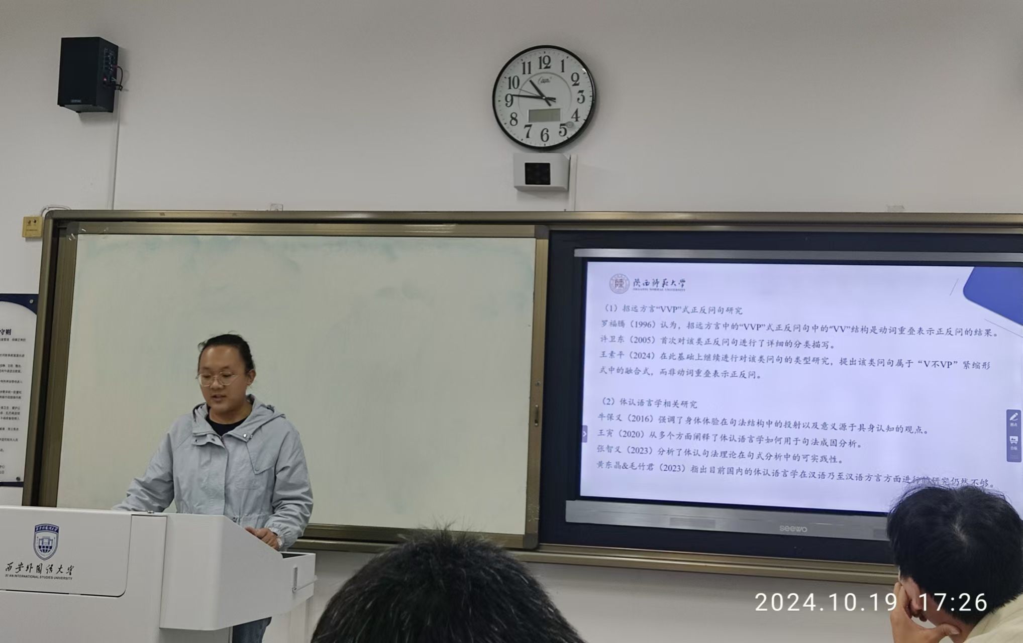 庞欢的发言题目为“体认视域下的汉语二语教学语法体系的思考”,以体认语言学为基础,“体认式”教学思想为核心,对汉语二语教学语法进行了思考。从体认的角度阐述了教学语法项目的解释、偏误分析与教学建议。