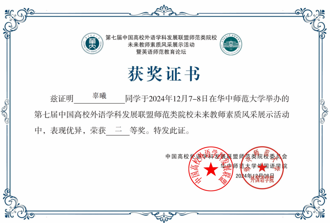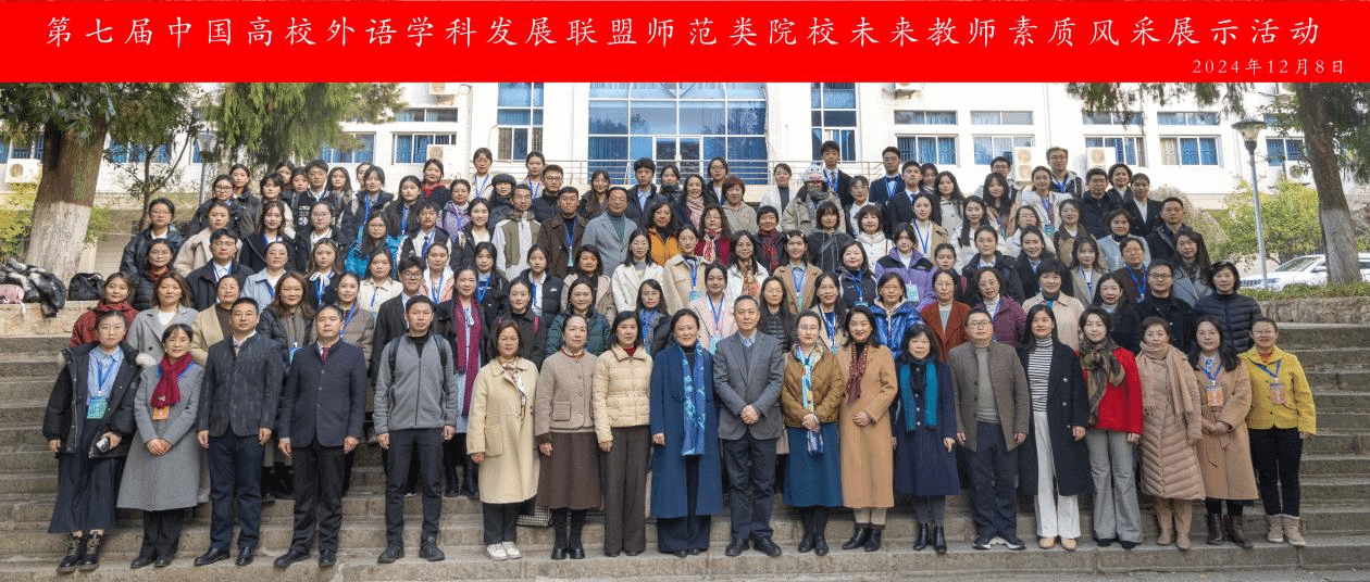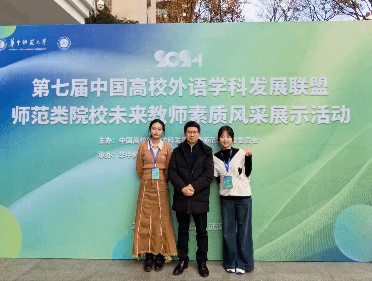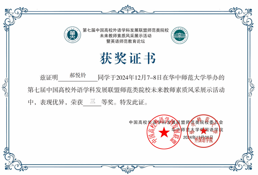 2024年12月7-8日,“第七届中国高校外语学科发展联盟师范类院校未来教师素质风采展示活动”在武汉举行。该活动由中国高校外语学科发展联盟师范类院校委员会主办、华中师范大学承办,来自全国41所院校的80名优秀师范生参加了此次活动。best365英语系2022级师范生辜曦、郝悦铃两位同学表现优异,分别获得二等奖和三等奖。指导老师杨冬敏、丁礼明荣获优秀指导教师称号。