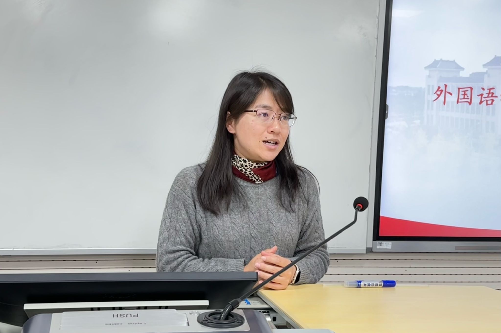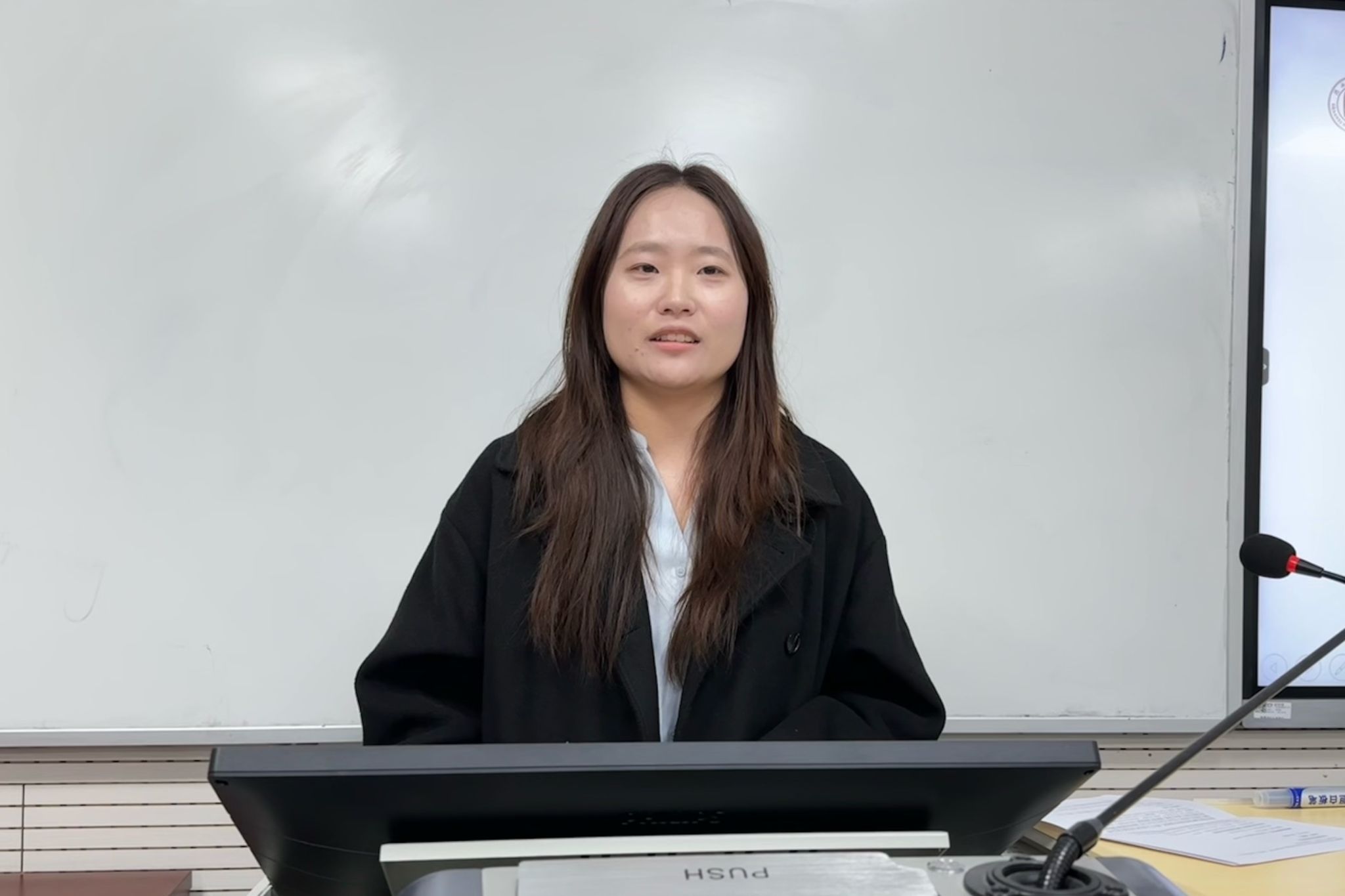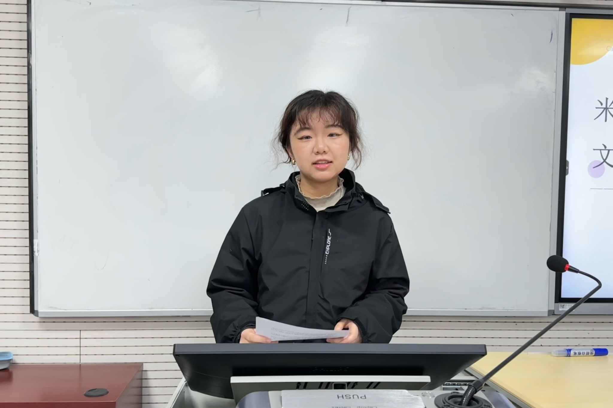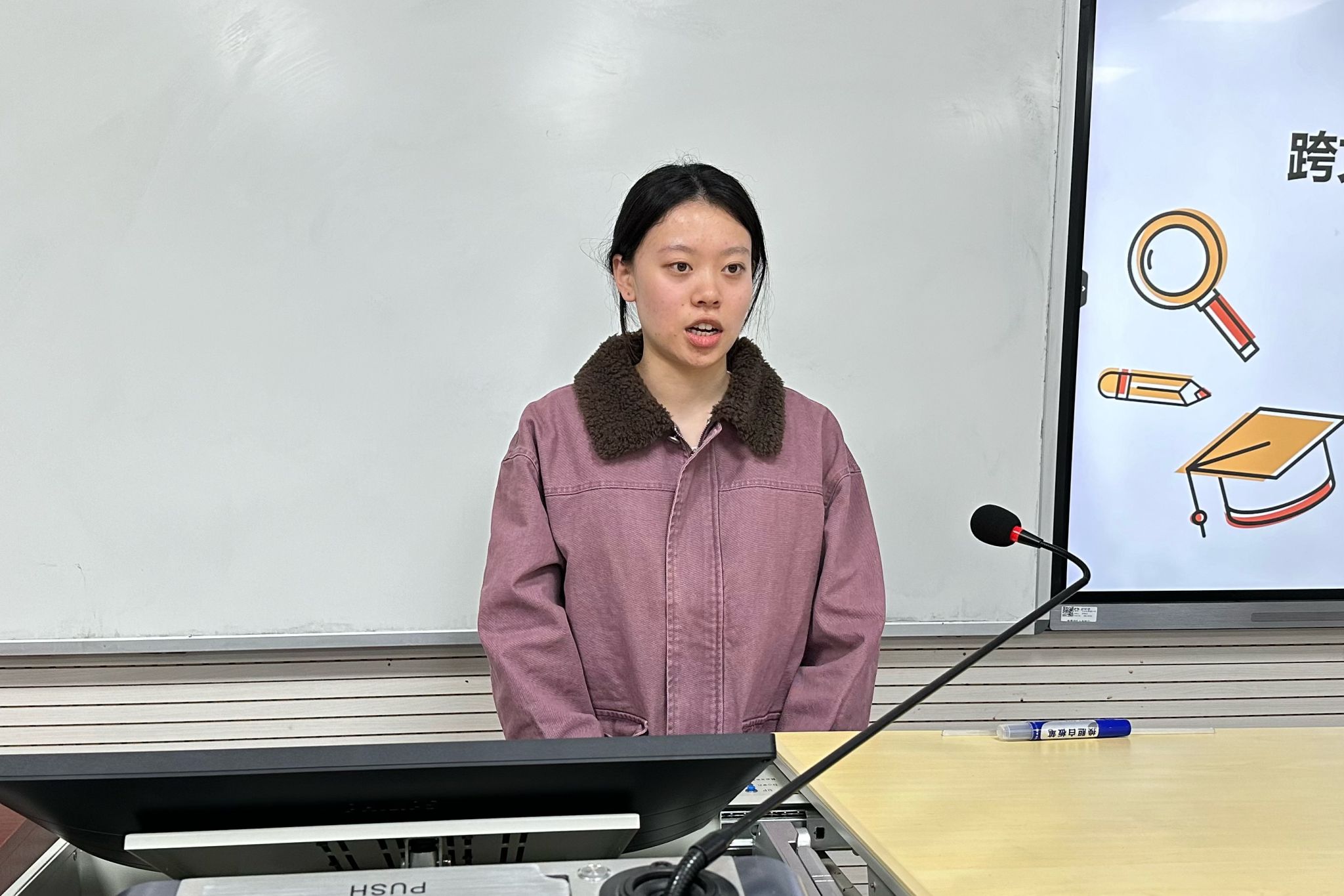 王姝颖和夏艺菡以“跨文化交流”为主题,分享了她们在韩国庆北大学的交换经历,涵盖交换项目简介、韩国生活、学术学习、语言学习、交换体验等方面。王姝颖从自身收获出发,介绍了她在留学期间所习得的学术论文写作相关知识。夏艺菡以个人学习经历为例,向在座同学介绍了学术写作课的教学过程。