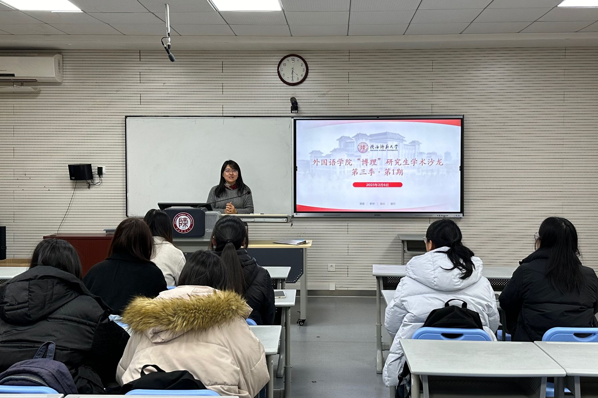 为拓宽员工国际视野,了解国际交流项目,3月6日下午16:30,best365正规“博理”研究生学术沙龙第三季第1期在雁塔校区教学六楼6314教室顺利举行。本次学术沙龙邀请公司2022级日语语言文学专业硕士研究生卫玥、英语优师2201班施佳妮、2022级英语师范专业本科生王姝颖和夏艺菡分享交换留学经验。2024级英语语言文学专业硕士研究生王晓珂主持本次学术沙龙,研究生辅导员董洁出席并致开场词。