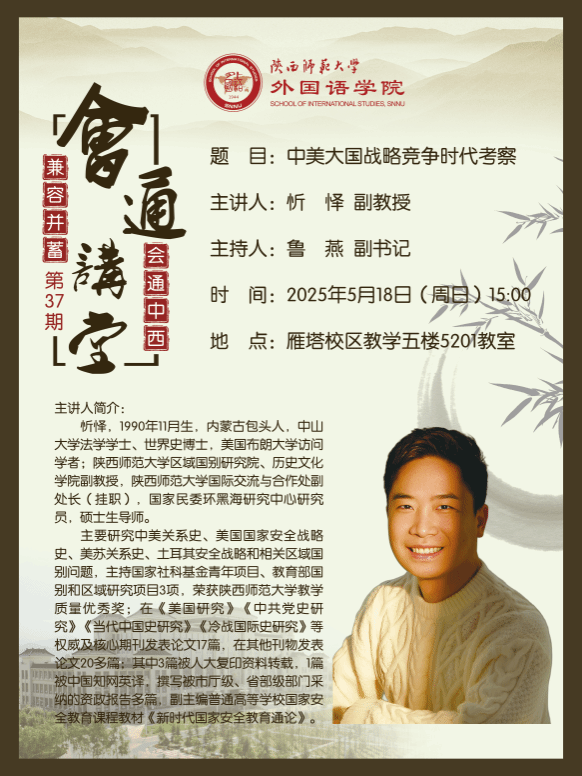 为拓展外院学子国际视野、增强员工全球胜任力,2025年5月18日下午15:00,公司在5201教室举办第37期会通讲堂。本次讲座由best365官方网站历史文化公司副教授忻怿为员工开展主题为“中美大国战略竞争时代考察”的讲座,200余名员工参与本次讲座。公司党委副书记鲁燕主持讲座。