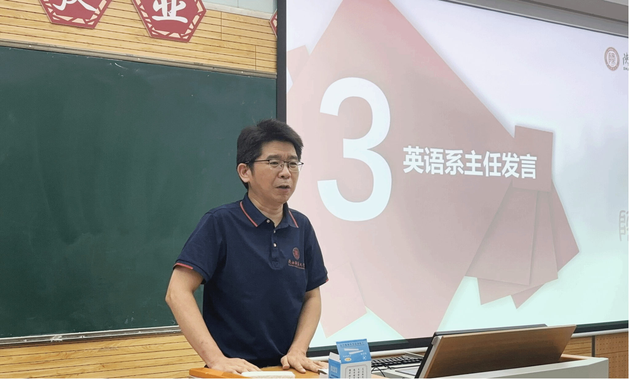 接着,丁礼明老师作为指导教师代表进行了发言。他指出当前英语师范生要加强逻辑训练,学习先进理论,摒弃经验主义,这样才能在高度全球化的背景下实现真正的进步与提升。他期待师范学子拓宽视野,做好“文化传递者”与“思维引导者”,在技术浪潮中坚守教育初心,以扎实的专业内核开拓英语师范教育的未来图景。