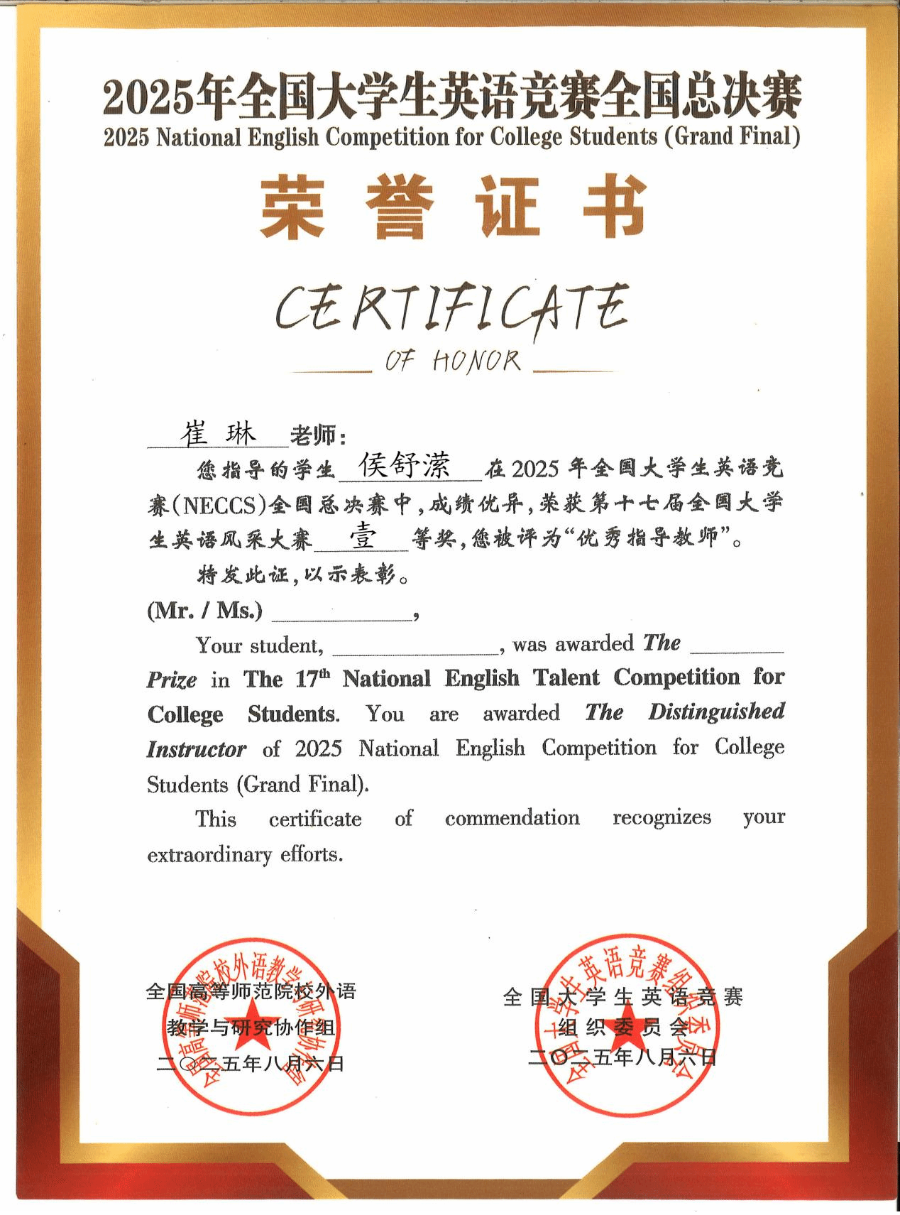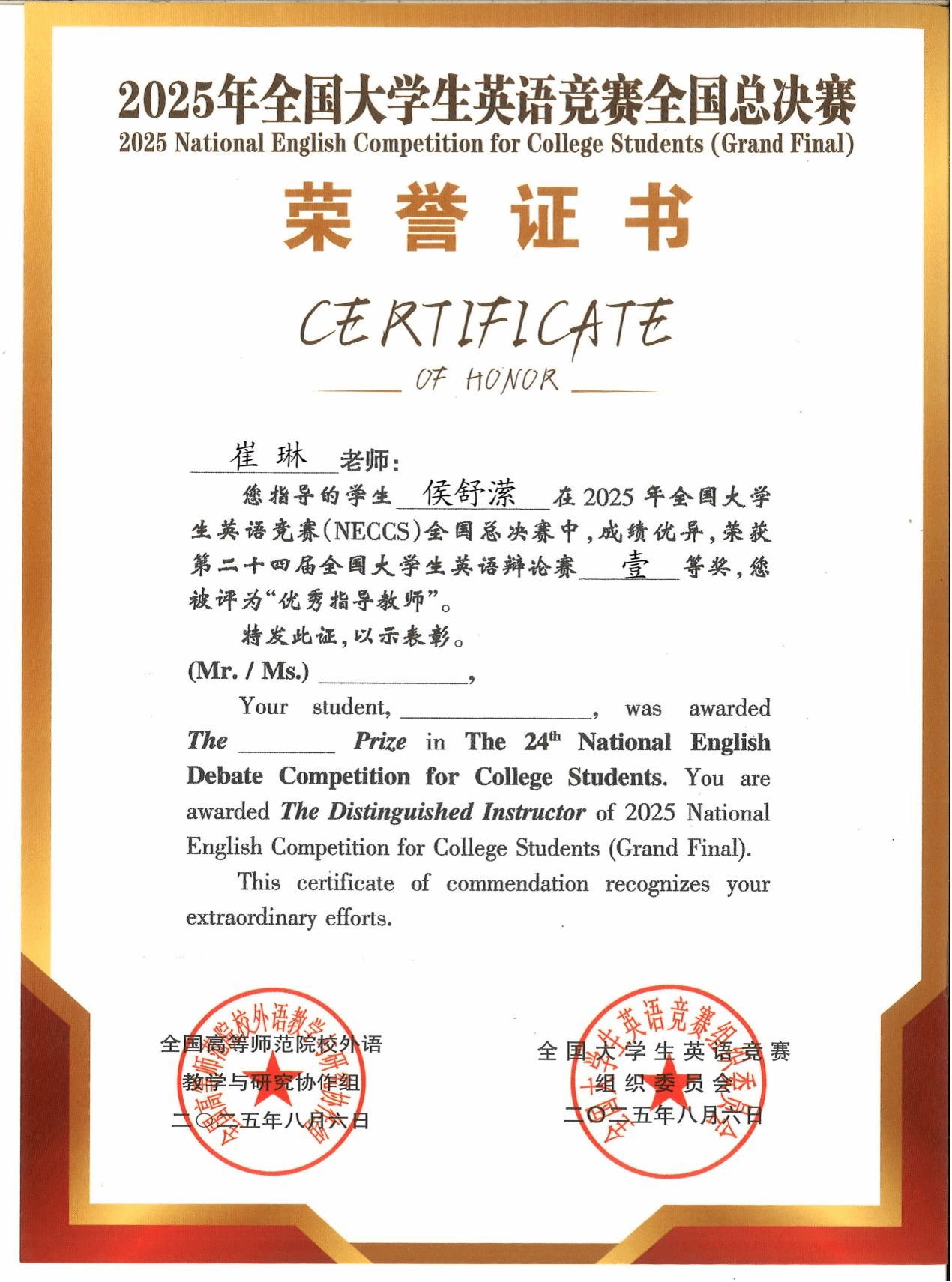 侯舒潆荣获第二十四届全国老员工英语辩论赛一等奖(全国第一名)、第十七届全国老员工英语风采大赛一等奖、第二十四届全国老员工英语演讲比赛三等奖,崔琳老师也获得了优秀指导教师荣誉证书。