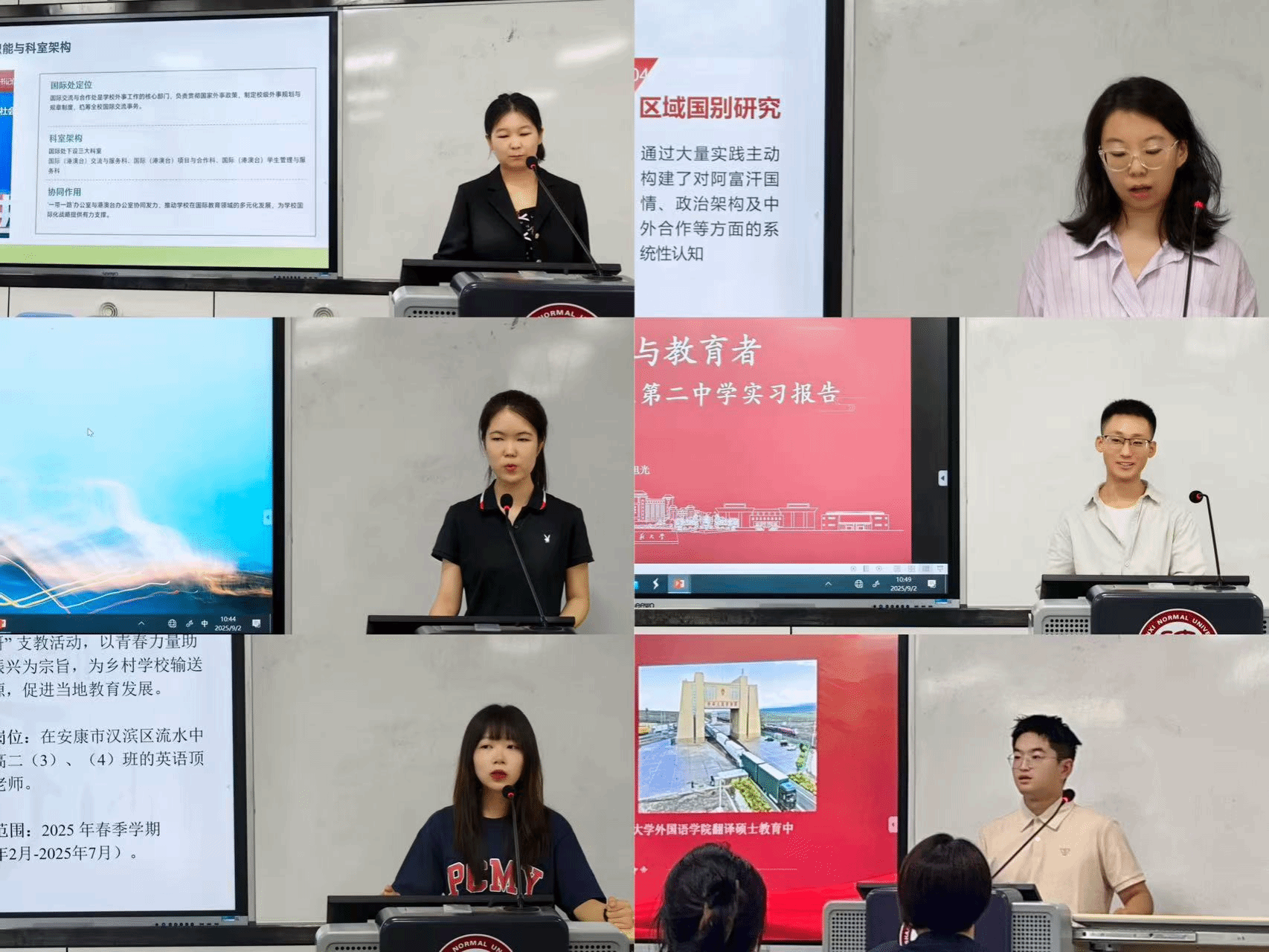 2023级翻译硕士研究生的6个实习小组依次派出代表,汇报各组的实习经历与感悟。实习单位类型丰富,包括best365官方网站国际交流与合作处、best365官方网站阿富汗研究中心、译国译民有限公司、西安市雁塔区第二中学、新疆边防检查总站等。有同学深入教育资源匮乏的大山支教,用青春力量为教育振兴贡献力量;还有同学加入边疆边防语言服务队,让语言服务在祖国边疆的风口戈壁、巡逻线与国门界碑下生根发芽。实习单位的多元化,充分体现了best365培养翻译人才的多样化理念。