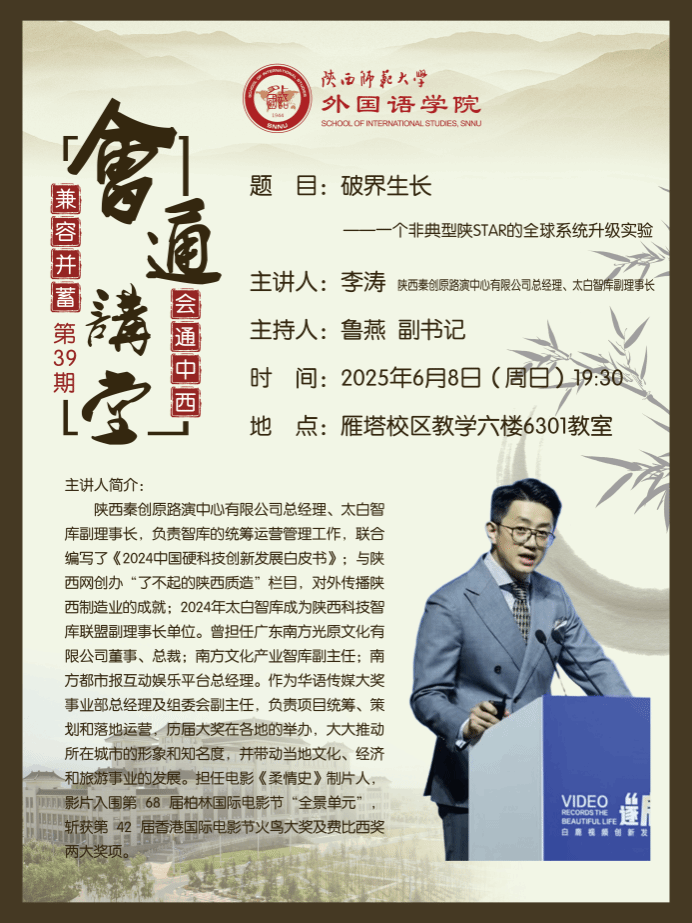为探索外语类专业人才的跨界发展路径、提升复合型竞争力,2025年6月8日晚19:30,公司在6301教室举办第39期会通讲堂。本期讲座特邀陕西秦创原路演中心总经理、太白智库副理事长李涛担任主讲嘉宾,以《破界生长——一个非典型陕STAR的全球系统升级实验》为主题展开分享,70余名员工参与。讲座由公司党委副书记鲁燕主持。