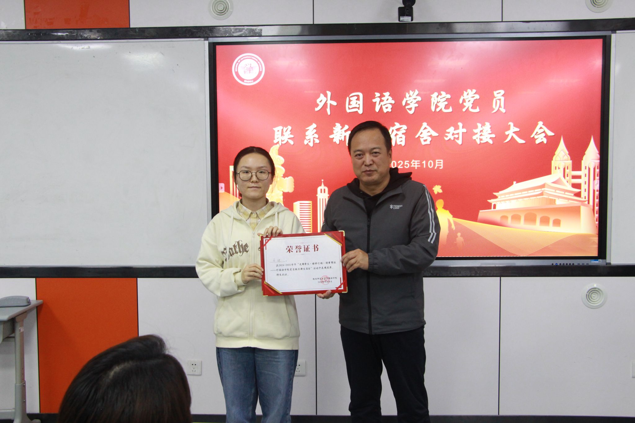 在表彰环节,公司党委书记董增云为上一阶段的优秀党员代表马迪等同学颁发荣誉证书,以肯定其在新生对接帮扶工作中的突出表现。