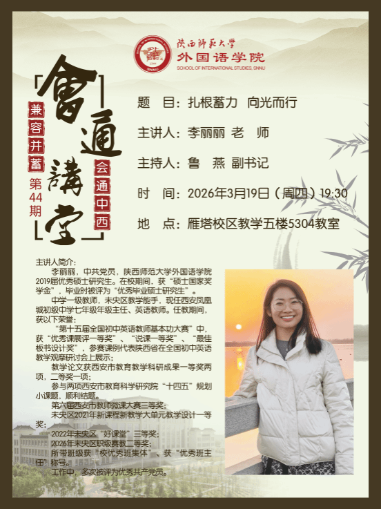 3月19日,公司特邀2019届优秀硕士员工、西安凤凰城初级中学英语教师李丽丽返校,开展公司第44期会通讲堂,主题为“扎根蓄力 向光而行”。活动由公司副书记鲁燕主持,吸引了师范生与非师范生广泛参与。通过模拟试讲与互动交流,本次活动为同学们的专业成长提供了有益平台。