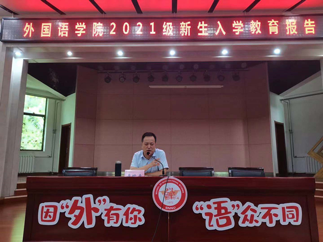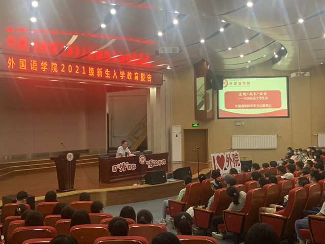 董书记首先对全体新生的到来表示热烈欢迎。接着他从发现角度谈起,鼓励同学们在大学四年间,要不断寻找自我,实现自我的锻造,成为一个理性、平和、自信、积极的自己,更要打好专业基础,成为中外文化互鉴的使者。其二,在成长层面,除了学好专业课知识外,还要努力学好人际关系、情绪管理、压力调节、人生规划和交友恋爱几门“课程”,培养自我认知能力、人际沟通能力、自我调节能力等,促进身心的全面发展。第三,在社会层面,广大青年要肩负历史使命,坚定前进信心,立大志、明大德、成大才、担大任,努力成为堪当民族复兴重任的时代新人,与时代发展同向同行发挥外语专业的特色,生动讲好“中国故事”。