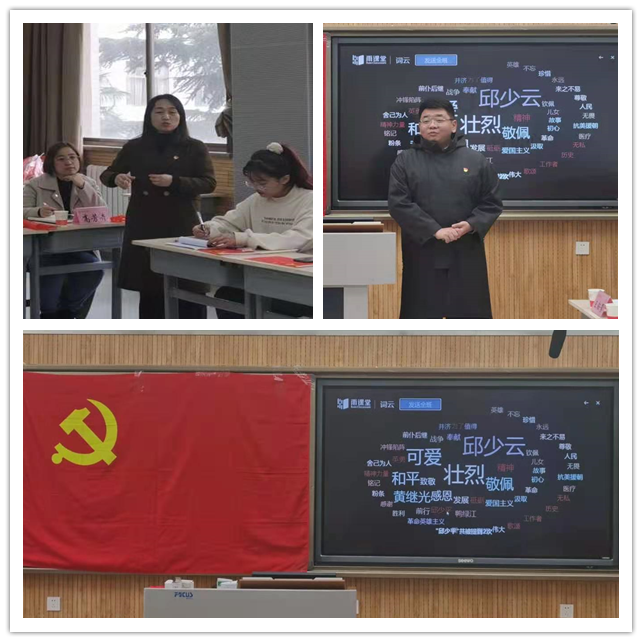 互动交流环节借助雨课堂小程序,以头脑风暴的方式收集了同志们对抗美援朝战争最深刻的认识和感受,支部成员就出现频次最高的关键词“黄继光”、“邱少云”、“壮烈”、“和平”等纷纷畅谈了自己的感悟。李晨子老师以“一捆粉条的故事”为主题词,讲述了外公参与抗美援朝作战的故事,映射出战士们舍生忘死,保家卫国的大无畏精神。鲁燕老师分享了主题词“传承精神力量”,谈到新时代青年人应牢记抗美援朝英雄,传承和弘扬伟大的抗美援朝精神,以史为鉴,鞭策青年人传递好新时代的接力棒。交流环节之后,刘新瑞等同志带来了诗歌朗诵《在抗美援朝纪念馆》,将组织生活会的氛围推向了高潮。