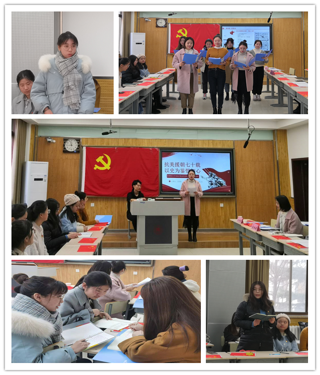 “一条大河波浪宽,风吹稻花香两岸……”会议伊始,支部全体成员挥动着手中的五星红旗,深情地歌唱《我的祖国》,在歌声的余韵中拉开了组织生活会的序幕。2020年是抗美援朝战争胜利七十周年,10月23日,习近平总书记在纪念中国人民志愿军抗美援朝出国作战70周年大会上发表了重要讲话。支部同志分小组接力朗诵了讲话中的金句,支部书记屈婉婷诵读人民日报社论文章:《大力弘扬伟大的抗美援朝精神》,带领同志们学习讲话精神,体悟新时代青年担当。知识抢答环节中同志们踊跃参与,通过对抗美援朝战争和新冠疫情阻击战中部分数据的查阅和学习,深化了同志们对历史现实的感悟。