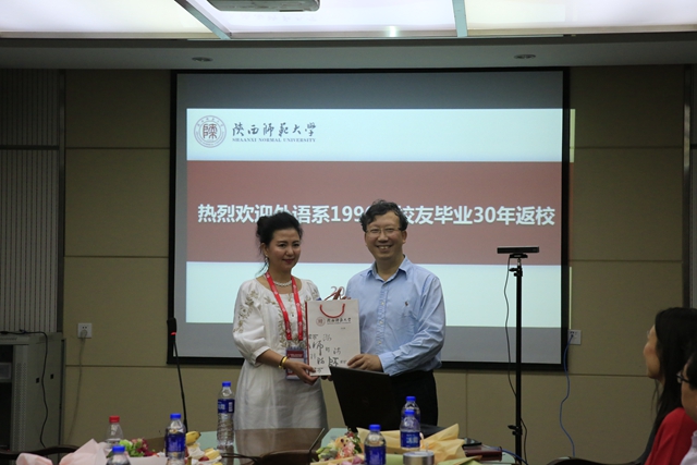 最后,公司向员工们赠送了纪念品——致外语系九零届毕业生的一封信、印有员工们姓名的定制印章、印有师大校训的折扇。王启龙经理代表公司接受了本届员工们的著作书籍,座谈会在师生热烈的掌声中圆满结束。