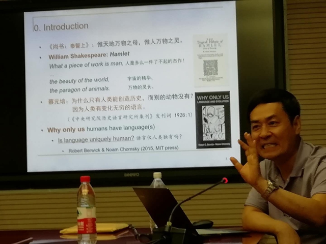吴义诚教授的报告从历史比较语言学的视角,以印欧语系、汉藏语系中若干语言样本为例,分析语言演化的规律和特征,聚焦于语言起源的刻意性。详实、丰富的例证在很大程度上动摇了索绪尔“语言任意性”观点在语言起源问题上的普适性。吴教授正在从事国家社科重大项目“基于大型语料库的汉语非组构性历时演变与语言演变规律研究”,其研究目的正是找到语言中音和义之间的刻意性关联。报告中,吴教授展示了他的一小部分研究成果,海量证据令在场师生耳目一新。在听众提问环节,吴教授以深入浅出的语言回答了师生提出的若干问题。