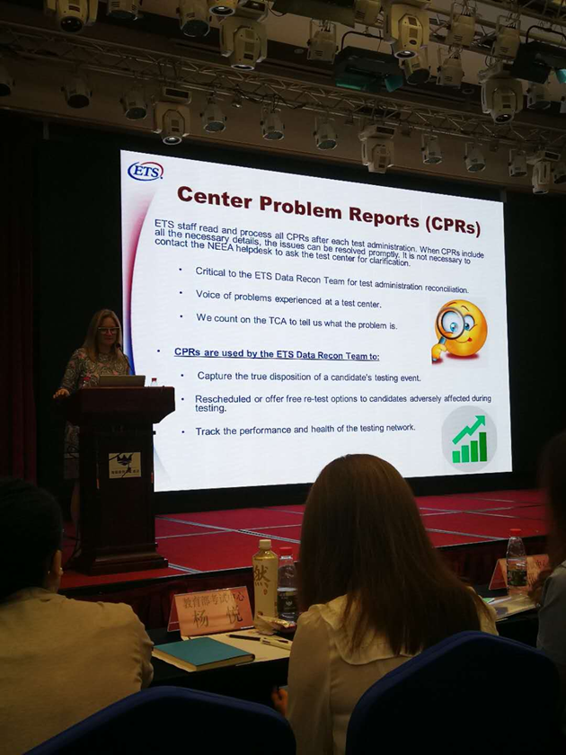教育部考试中心海外交流与合作处张进处长作了题为“国际国内考试安全形势”的主旨发言,介绍了托福考试最新动态,强调了考点负责人和考务人员所肩负的重大责任,部署了视频监控、人脸识别等系统开放升级后的工作要求。ETS考点管理部执行总监Beth Mowery女士在讲话中谈到,近年来随着中国考生数量的快速增长,中国已成为不可或缺的重要市场,感谢教育部考试中心和各考点为保证考试的安全以及提供的良好服务所做出的努力,对取得的可喜成绩表示祝贺。同时,她还介绍了ETS为进一步提升托福和GRE考试安全性、完善考务流程及贴心服务考生所采取的新举措。随后,教育部考试中心海外处副处长韩雁对2019年工作进行了部署。ETS中国办公室王梦妍、教育部考试中心韩敏分别就托福考试发展概况及新考点建设相关要求做了详细解读。