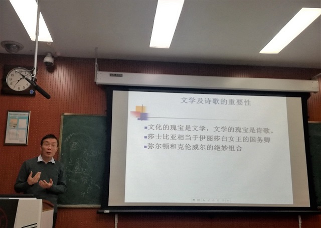 刘庆松博士以诙谐的语言向同学们介绍了文学及诗歌的重要性、翻译的功能、诗歌的可译与不可译、“三美”原则等方面,重点围绕“三美”原则在诗歌翻译中的具体译例,论、例相结合,深入浅出,鞭辟入里。在报告中,刘庆松博士指出文化的瑰宝是文学,文学的瑰宝是诗歌。诗歌的重要性不言而喻,而诗歌的翻译更是极具挑战性、趣味性。困扰同学们的诗歌可译性问题也需辨证看待,相对可译,绝对不可译。诗歌翻译不同于其他文学作品翻译,对形式韵律意境的要求更为严格。“三美”原则可为同学们诗歌翻译提供指导,但是最重要是兴趣支撑以及广泛涉猎,才能在鉴赏汲取的基础上提升自我翻译素质。同时,刘庆松博士带领全体师生深情朗读诗歌Tyger中英对比译文,为同学们带来了视觉听觉的双重别致享受。在问答环节,刘庆松博士回答了大家的问题,并再次提及了诗歌兴趣培养的重要性,勉励大家孜孜不倦,广泛阅读翻译相关书籍,找到个人研究点,取得学业进步。操林英副教授对讲座作了精彩点评。