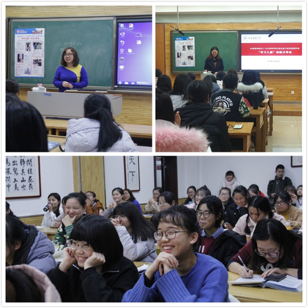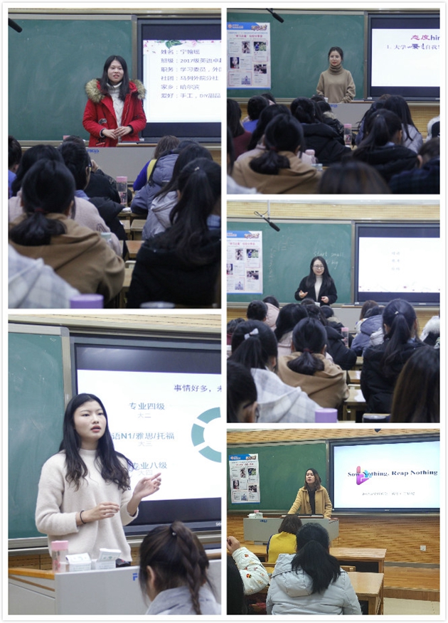 随后,5位同学分别分享了自己的成长经历和学习经验。2017级学科教学(英语)研究生王颖超主要就如何提高专业素养与人文素养给出了以下三个建议,一是合理规划,准确定位;二是端正态度,脚踏实地;三是拓宽渠道,挑战自我。2017级外应研究生陈成提醒同学要回顾反思自己2018年的学习与生活,并从课程、比赛、学术三个方面提出了许多合理可行的建议。针对老员工普遍的迷茫状态,2015级日语专业的宋甜甜同学提出要明确自己每一学年的目标,学会制定目标,她还就目标的实现总结了四个“一定”。2014级英语四班刘奕洁同学提倡要以学习态度、学习方法为重,充分利用好时间,抛却“及格万岁”思想,把压力转变为动力,她介绍了被动和自主两种学习类型,并分享了有效的英语学习方法。2017级英语卓越班宁翰瑶从心态、听课状态、学习效率、实践活动四个方面分别作出了细致入微的分析,她建议同学们做好学习记录,不断激励自己,从而得到进步。