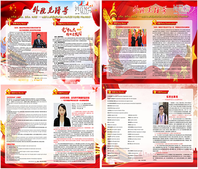 为了进一步加强师生党员的思想建设,公司党委每月定期开展党员主题宣传,同时每两周向各支部编发《外院先锋号》党员学习周报。周报分为“党情(Party News)”“党建(Party Construction)”“热词(Hot Words)”“先锋(Pioneer)”四个板块,从不同角度开展思想引领和政策宣传,加强党务知识培训。自2017年春季开始,目前已编印22期,针对党建热点和党务规范开展宣传,并先后采写公司优秀师生党员先进事迹10余人,起到了较好的榜样引领作用。