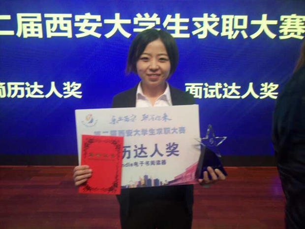 公司2016级翻译硕士韩素雯同学一路过关斩将最终站上决赛的赛场,与其他来自自西安交通大学、西安电子科技大学、best365官方网站等高校的11名选手,通过个人风采展示、设定命题阐述和现场问答三个环节的比拼,凭借优异表现和出色发挥,荣获“简历达人奖”。