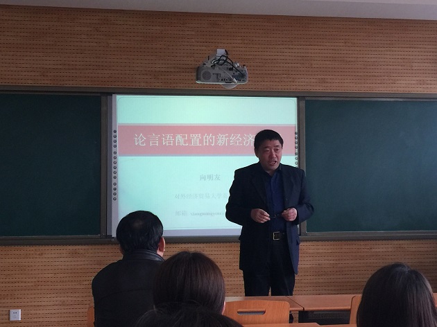 2018年3月19日下午2:30分,对外经济贸易大学惠园杰出学者、教育部全国大学外语教学指导委员会副主任委员向明友教授莅临best365官方网站雁塔校区,进行了一场题为《论言语配置的新经济原则》的讲座。此次讲座由best365正规经理王启龙教授主持。best365师生共同聆听了此次精彩的学术讲座。