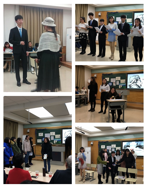 接下来的话剧表演《变色龙》仿佛把我们带到了那个广场上,员工们以丰富的肢体语言,惟妙惟肖的地还原了当时的事件,他们用实力获得了大家的阵阵掌声。大一同学虽然才刚刚接触俄语,但也积极参与到活动中来,他们每人一句用俄语朗诵作家的经典名句,现场师生为他们的热情纷纷点“赞”,报以热烈的掌声。大二同学带来的俄罗斯名曲《山楂树》深情动人,尤克里里的伴音曲调悠扬,歌曲词语意蕴延绵,令人倾倒。大三单永燕、何明珂等同学表演的小品《彩票》依据契诃夫同名作品改编而成,她们采用了新颖的表演形式,带领观众在“现实”与“想象”中穿梭。风趣的语言,滑稽的表演,引得现场笑声连连。各节目间还穿插有员工独唱,她们的嗓音优美,传递着来自俄罗斯文化的独特魅力。最后,话剧《三姐妹》为本次“契诃夫阅读日”活动画上了圆满的句号。