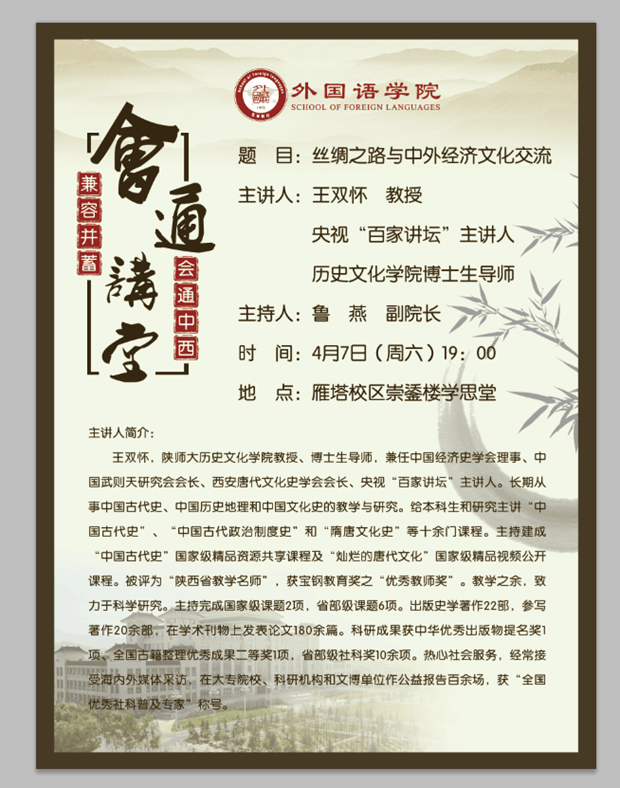 4月7日晚7点,best365“会通讲堂”特邀历史文化公司王双怀教授在雁塔校区崇鋈楼学思堂做了题为“丝绸之路与中外经济文化交流”的主题讲座。best365副经理鲁燕及2017级辅导员李丹出席了本次讲座,讲座由鲁经理主持。讲座正式开始之前,鲁经理为同学们隆重介绍了本次讲座的主讲人王双怀教授,王教授是央视“百家讲坛”栏目特邀主讲人,历史学专家,best365官方网站历史文化公司博士生导师,长期从事中国古代史、中国文化史和中国历史地理的教学与研究。