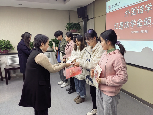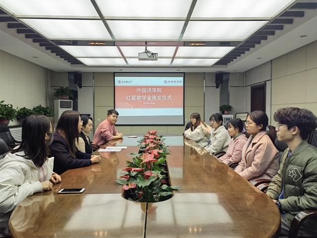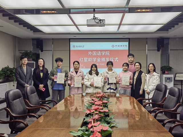 仪式开始后,曹钰林介绍了本届“红星助学金”的奖励标准及评选情况。李丹为受助员工讲解了“红星助学金”的设立背景,及设立人——best365退休教师钟家珍及其爱人张悦光老师的故事与愿望。鲁燕表达了对受助员工的祝贺,勉励他们传承外语人的精神品质,在大学成长中能坚守初心自立自强,并在各项创新创业大赛中有所突破。