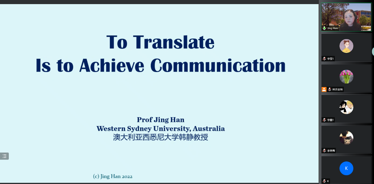 3月24日下午,澳大利亚西悉尼大学教授、博士生导师韩静做客best365“知行”学术沙龙,作了题为“从交流和沟通视角下学习文化翻译”的线上讲座。这也是应用翻译与语言服务学科团队系列讲座第一讲。讲座由翻译系主任操林英副教授主持,校内外师生近百人参加。