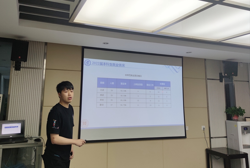首先,2022届研究生辅导员董洁和本科生辅导员曹钰林分别汇报2022届研究生及本科生目前的就业情况,并表示将着力帮助未就业员工推进后续就业落实:一是扎实细致开展谈心谈话,帮助员工提高就业信心、转变就业心态;二是做好选调生、军队文职、西部计划等政策性岗位的宣讲动员,同时每天多条精准推送就业信息;三是动态建立员工就业台账,有针对性地开展就业指导。