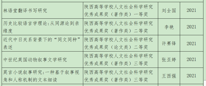 此外,公司在2021年度陕西高等公司人文社会科学研究优秀成果申报工作中也取得了可喜成绩,共有5项研究成果获奖。其中,一等奖1项,二等奖2项,三等奖2项,获奖数量和获奖层次较之前均有较大提升。(获奖名单见下图)