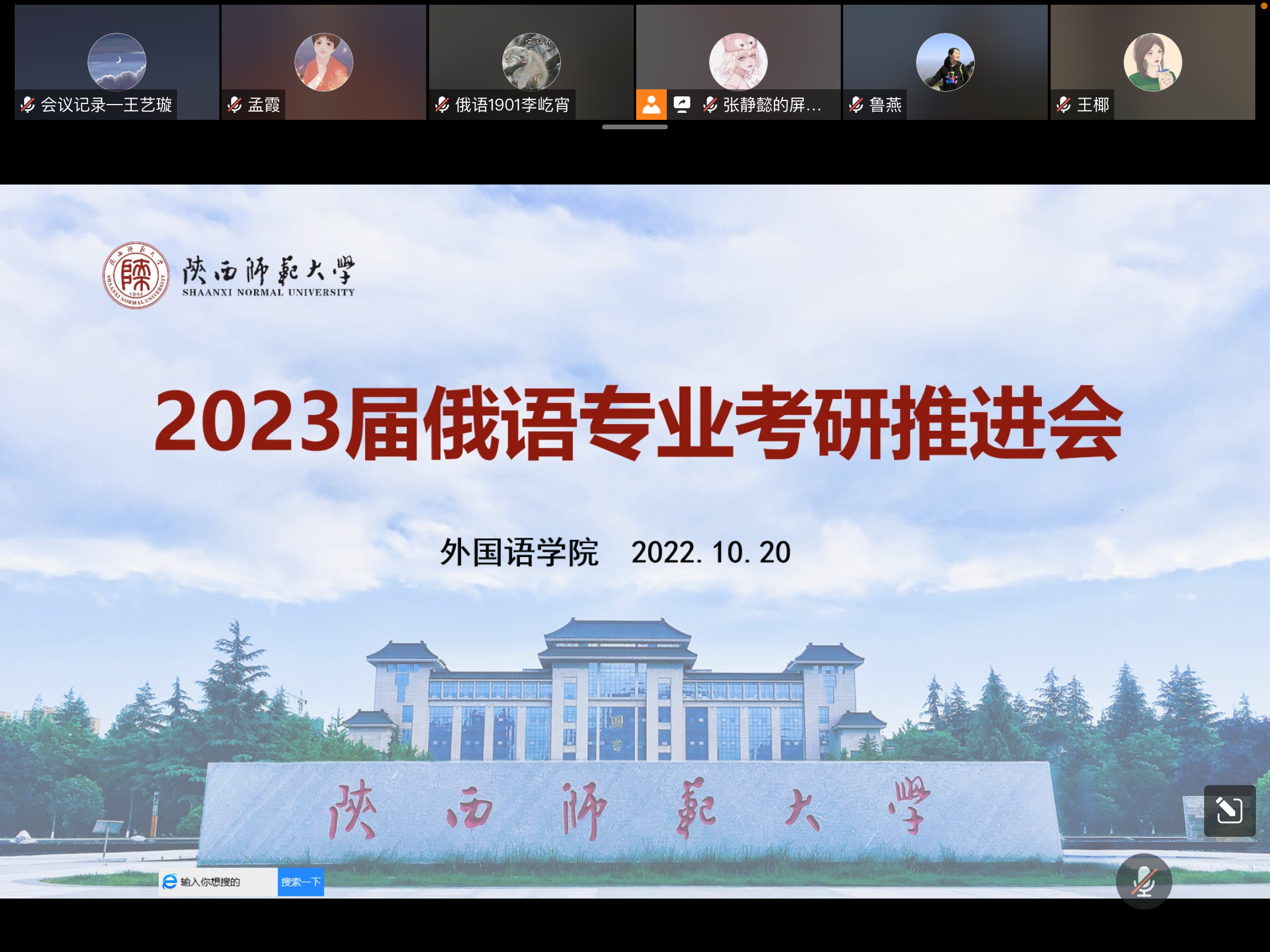 为增强同学们的考研信心和动力,公司于10月20日上午通过腾讯会议线上召开2023届俄语专业考研推进会。俄语系主任孟霞老师和俄语1901班全体考研员工共同参加。会议由公司党委副书记鲁燕老师主持。
