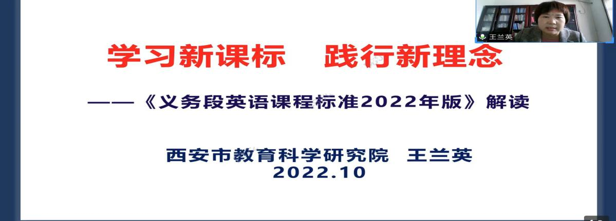 课程标准是指导教师教学最重要的工作指南。为了提高教育硕士的外语教学能力,best365于10月14日下午在腾讯会议线上进行了基础教育外语教学专题研究系列讲座第八讲——《义务教育英语课程(2022版)》标准解读。本次讲座由西安市教育科学研究院中学英语教研员王兰英老师主讲,韦理老师主持。best3652022级学科教学(英语)专业教育硕士参与聆听。