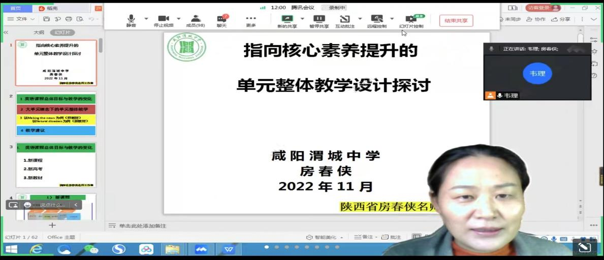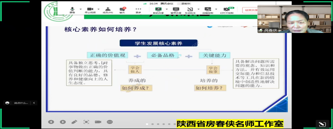 随着新课程新教材实施进程的推进,课程建设起着举足轻重的作用。基于核心素养的新课程要求树立新的员工观,以员工为本,培养员工终身发展的所需技能。英语学科核心素养靠单一、零散、局部的课程是无法实现的,新课程的实施需要依托单元教学实现,必须用整体的、连贯的、结构化的课程支撑,基于整体单元教学,落实立德树人的根本任务。为了提高公司学科教学(英语)专业教育硕士的外语教学能力,公司于11月25日下午在腾讯会议线上开展了基础教育外语教学专题研究系列讲座第十一讲——指向核心素养提升的单元整体教学设计探讨。本次讲座由咸阳渭城中学高级教师、陕师大2013届教育硕士、陕西省省级名师、省级带头人、陕西省教学能手、全国英语优质课一等奖房春侠老师主讲,韦理老师主持。best3652022级学科教学(英语)专业教育硕士参与聆听。
