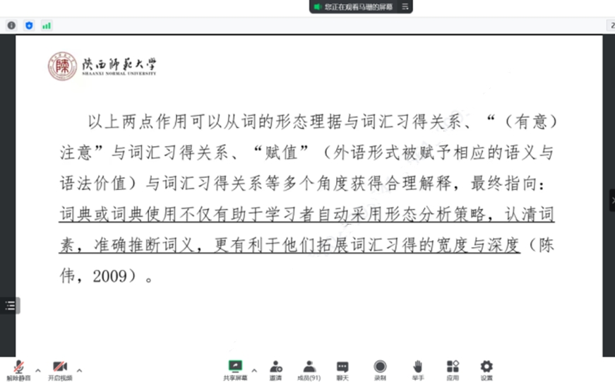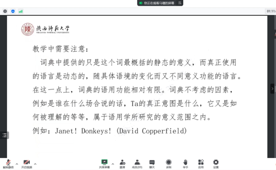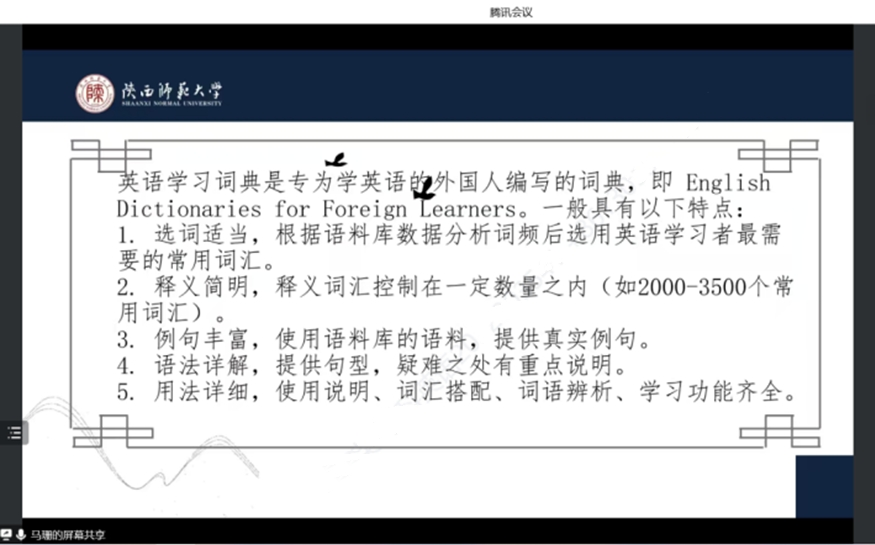 首先马老师通过引入日常生活中词典的使用,强调了词典的重要性。她指出作为教师,我们应该教会员工意识到词典工具的重要性以及教会员工使用词典这一重要的工具。接着马老师对于词典与外语教学的对接面进行了学理归因。