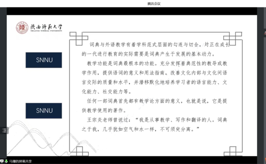 为了提高公司学科教学(英语)专业研究生的外语教学能力,加强员工对外语教育学科价值的理解,best365于12月2日下午在腾讯会议线上开展了外语教育学科前沿讲座第十三讲——英语学习型词典与外语教学。本次讲座由best365正规马珊老师主讲,会议由韦理老师主持。best3652022级学科教学(英语)专业教育硕士聆听了讲座。