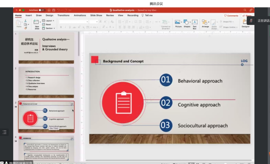 本次讲座从Behavioral approach 、Cognitive approach 和Sociocultural approach三个方面介绍了该讲座的研究背景和关键概念,并且通过分享视频的方式向大家介绍了皮亚杰认知发展理论不同阶段的不同特征。