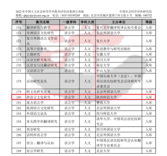 《AMI综合评价报告》是目前国内学界主要的核心期刊目录之一,主要从吸引力、管理力和影响力三个层次对期刊进行评价,实行一票否决制,具有高度的学术权威性和社会认可度。自2014年起,中国社会科学评价研究院每四年开展一次期刊评价工作。2022年,在第三轮期刊评价工作中,对中国人文社会科学33个学科类的1924种老牌刊、117种新创刊和148种外文刊,共计2189种期刊进行了评价。《Journal of Tibetan and Himalayan Studies》被列入148种外文刊之中。本轮还新增学术集刊评价,403种集刊中共有48种入选本次评价,《跨语言文化研究》即为其中之一。
