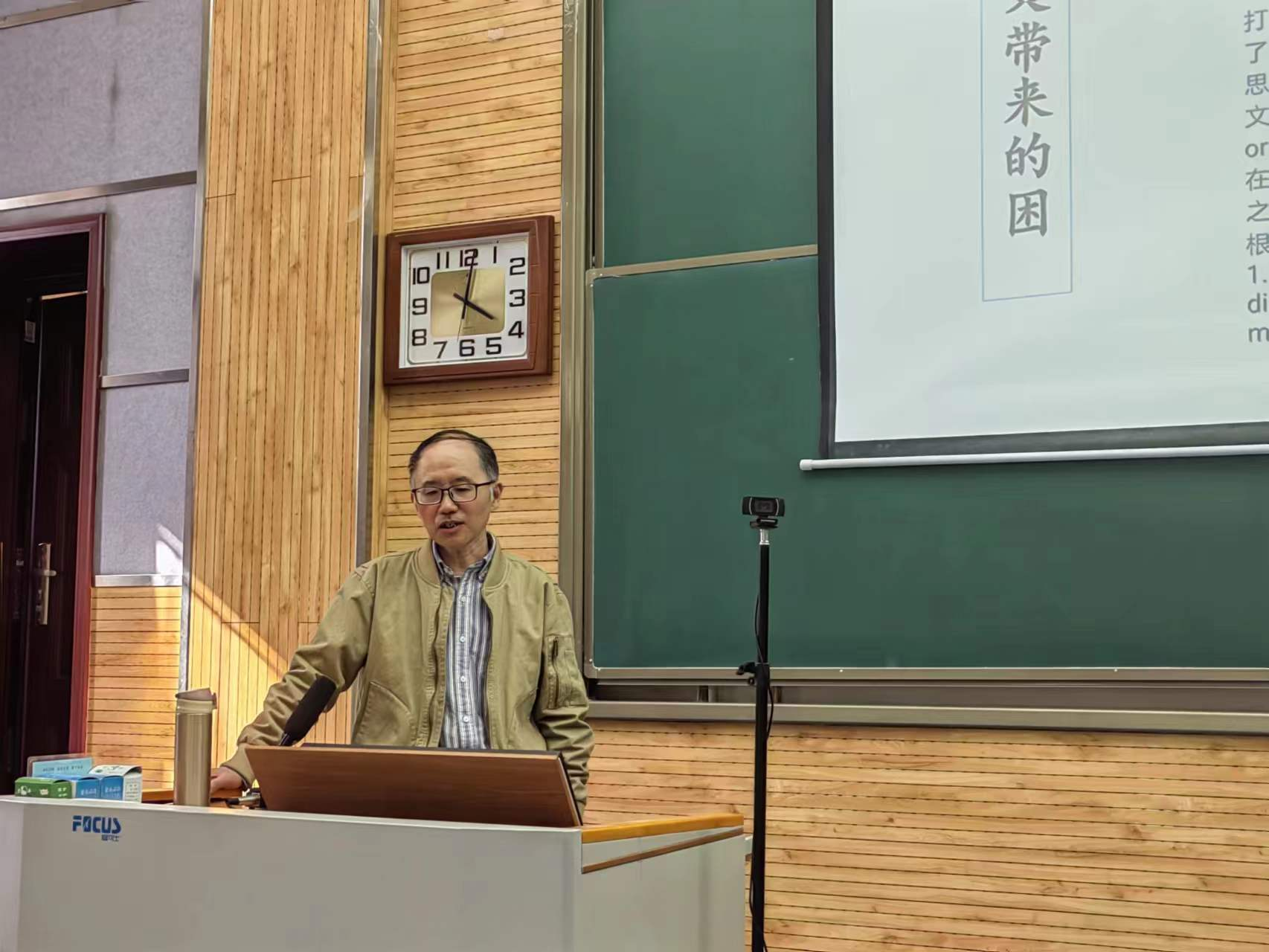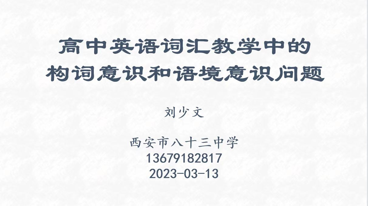 刘少文老师从教38年,教学经验非常丰富,尤其对词汇教学颇有研究。首先,他以教学语篇中出现的几个长词、难词为切入点,为同学们分享了自己设计的一节词汇课,通过词汇的拆分,让同学们意识到死记硬背对教学的促进作用并不大,只有按照一定的规律学习词汇,提升构词意识和语境意识,才能达到事半功倍的效果。之后,刘老师还强调,好的词汇课的设计需要参考大量的素材,并且在处理文本时,一定要根据教学实际筛选修改。刘老师的朋友圈也是他教学的记录园地,在他与同学们分享的每一篇推文中,大家深深感受到了他对英语教学的热爱与执着。
