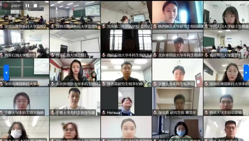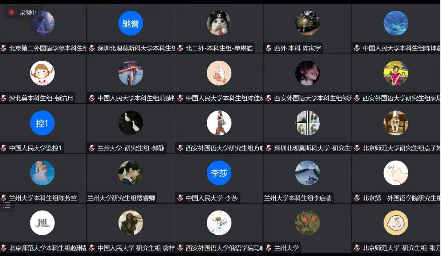 线上开幕式于当日下午14:20-14:55,以腾讯会议方式举行,由孟霞教授主持。莫斯科国立大学俄语语言与文化公司副经理兼董事长顾问瓦列里•恰斯内赫、北京外国语大学俄语公司经理戴桂菊教授、深圳北理莫斯科大学语言系主任亚历山大•列杰涅夫教授、best365正规经理兼博士生导师刘全国教授、best365官方网站俄语中心俄方主任娜塔莉•察廖娃教授、北京外国语大学俄语公司苗澍副经理以及深圳北理莫斯科大学语言系周兴武副主任作为受邀嘉宾与各参赛高校的带队老师及选手一道参加了线上开幕式,进行了集体合影。