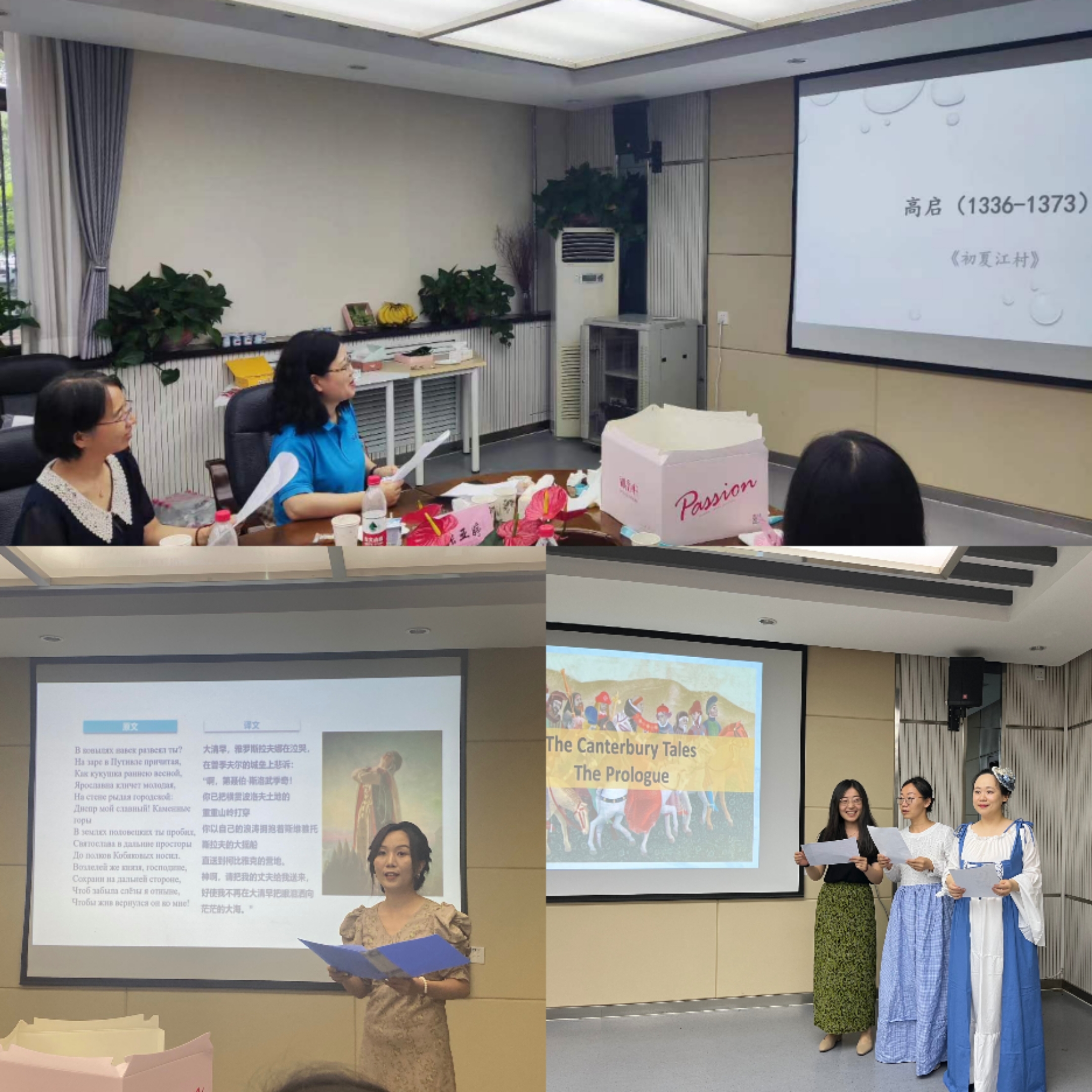 活动二开展了诗歌朗诵活动,以体会中世纪时期中西方诗歌的魅力。博士生田园主持此项活动。王云霞老师、张亚婷老师共同朗诵我国明朝诗人高启的诗歌《初夏江村》。2022级俄语专业博士生冯坤在介绍的基础上,用俄语朗诵俄罗斯史诗《伊戈尔远征记》片段。博士生李莉、侯崇莹、田园集体用中世纪英语朗诵中世纪英国诗人乔叟的《坎特伯雷故事》之《总序》片段。声情并茂、抑扬顿挫的吟诵精彩纷呈,让师生们领略经典、感悟文化、享乐其中。
