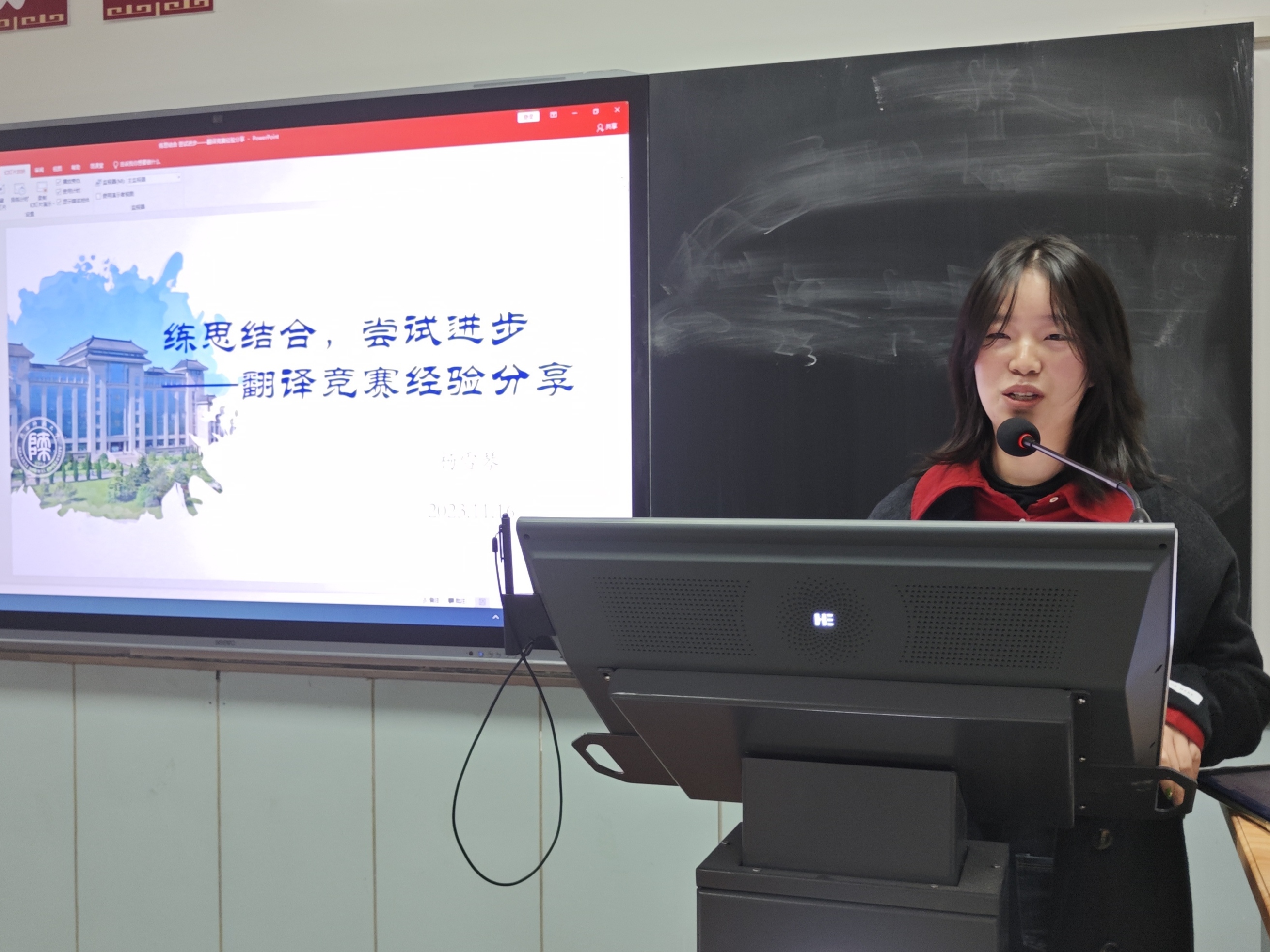 杨雪琴同学以《练思结合,尝试进步》为题作笔译竞赛经验分享。她介绍了自己英语二级笔译证书、海伦·斯诺翻译竞赛和“优译杯”全国技术翻译大赛的备考和参赛经验,建议大家加强翻译练习和积累,提高语言运用能力。