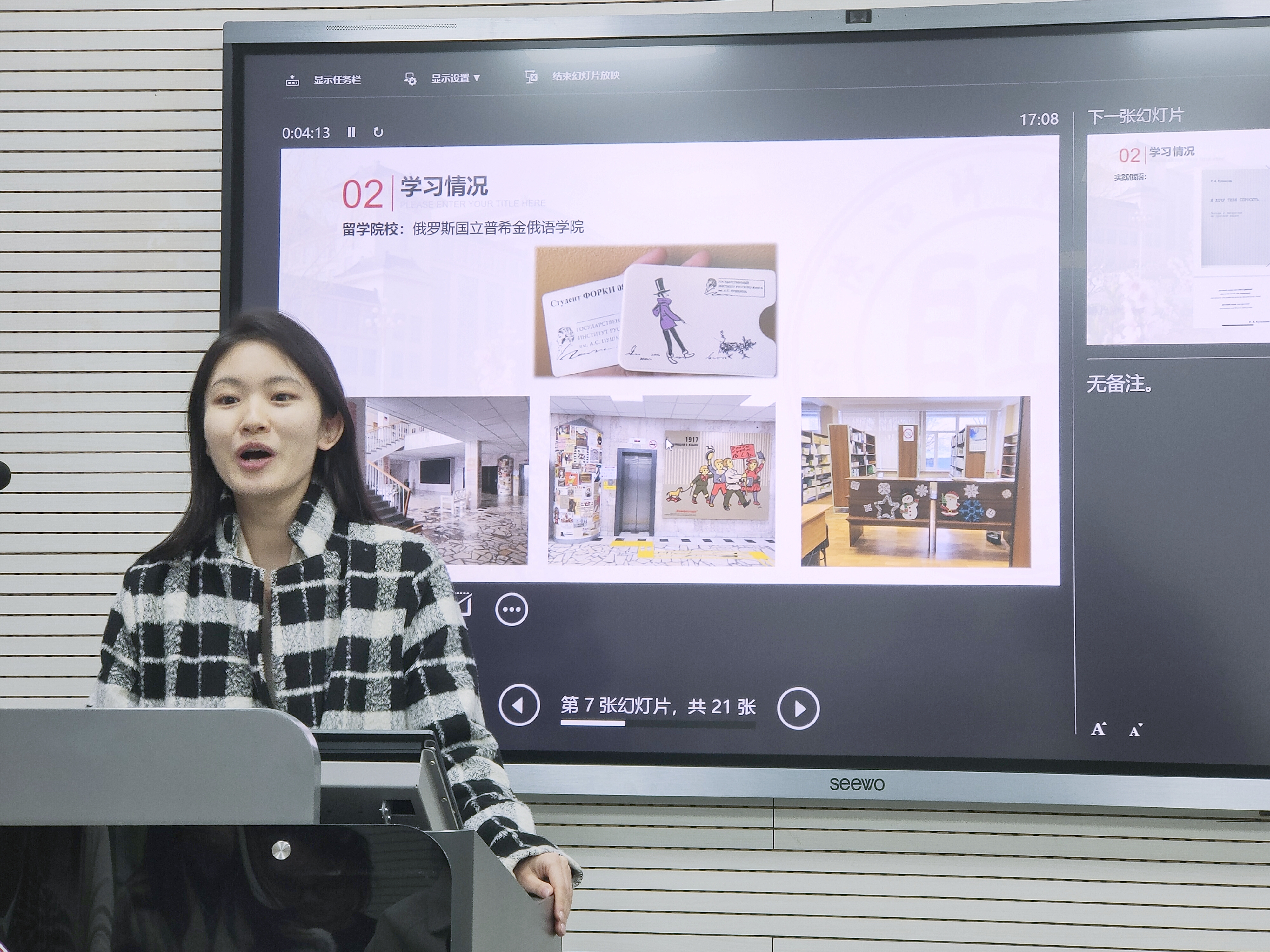 为进一步帮助best365员工了解公派留学经验,拓展专业学习的深度与广度,培养广阔的国际视野,11月23日下午,best365“博理”研究生学术沙龙第一季第5期于雁塔校区教学六楼6325教室举行。本次会议邀请公司2021级俄语语言文学专业研究生田卓、田欣雅和2022级英语(创新实验班)本科生齐文清作分享汇报,2023级学科英语专业王乌云主持会议,公司日语与俄语专业同学参加会议。