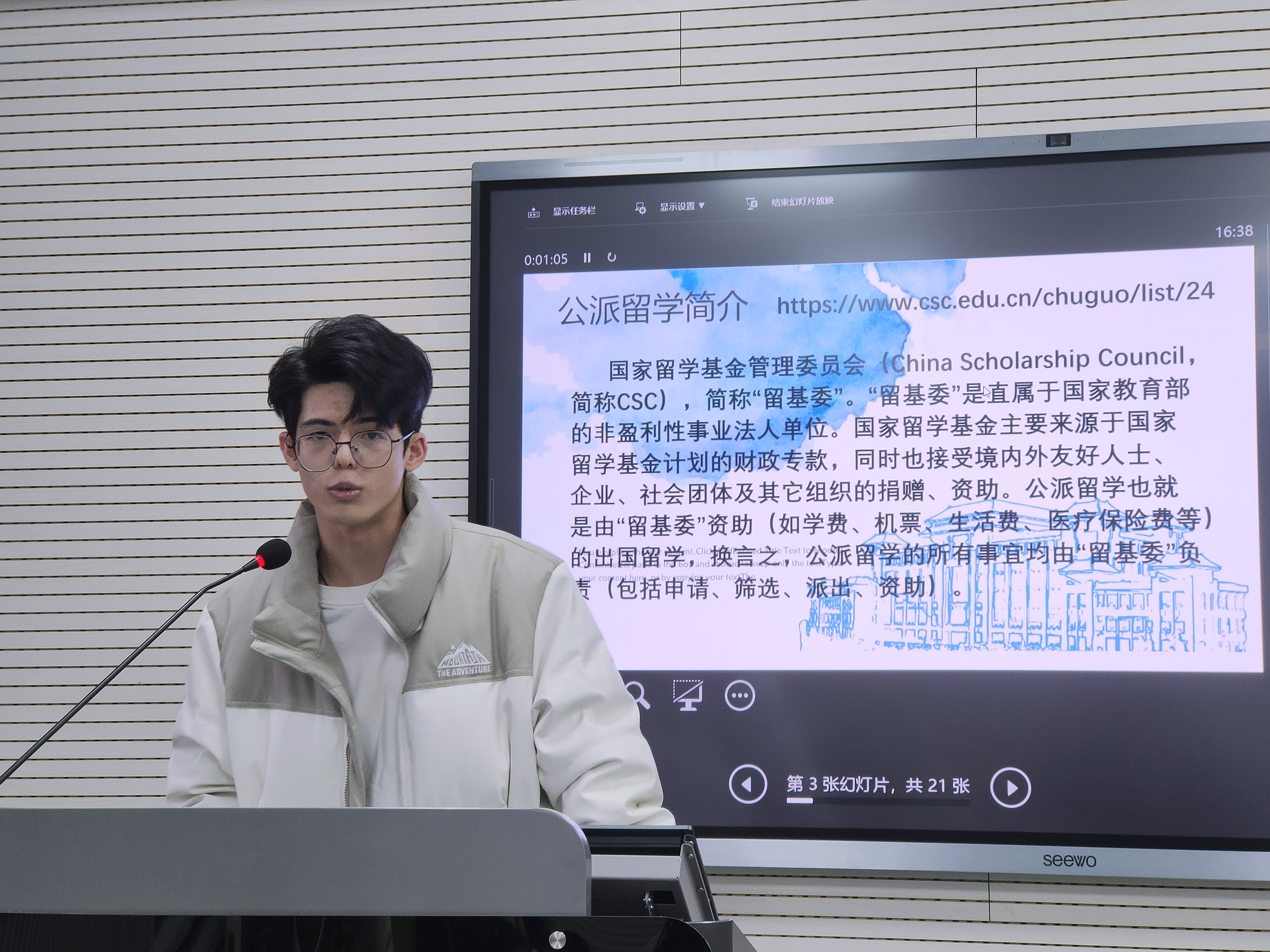 田卓同学以《开拓视野,感知文化》为题作公派留学经验分享。他细致讲解了公派留学类别、留学时限、资助数额、申请流程等信息,并结合自身留学经历,提出相关注意事项。田卓同学展示了摄影作品,使在座观众领略到俄罗斯风光,了解职工的日常生活。最后,他鼓励同学们亲身体悟异域文化,打破对他国文化的刻板印象。