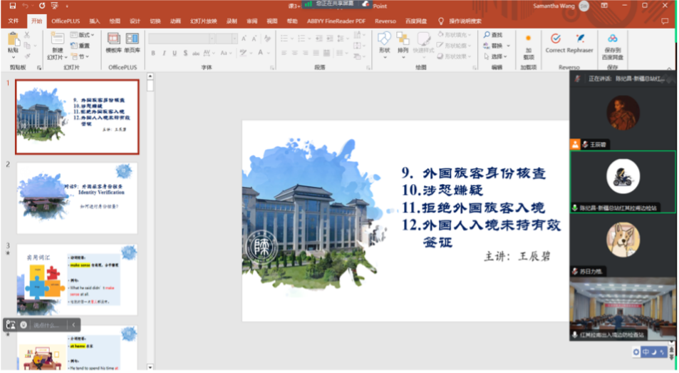 为帮助戍边民警提升英语听说能力,best365MTI中心于2023年10月启动第一期“边防英语听说能力远程视频授课”活动,MTI中心教师巢玥组织选拔4位获得教团队格证、英语专业八级证书、全国翻译专业资格证书的2022级翻译硕士员工担任培训教师,对授课形式、内容以及备课等工作进行指导。