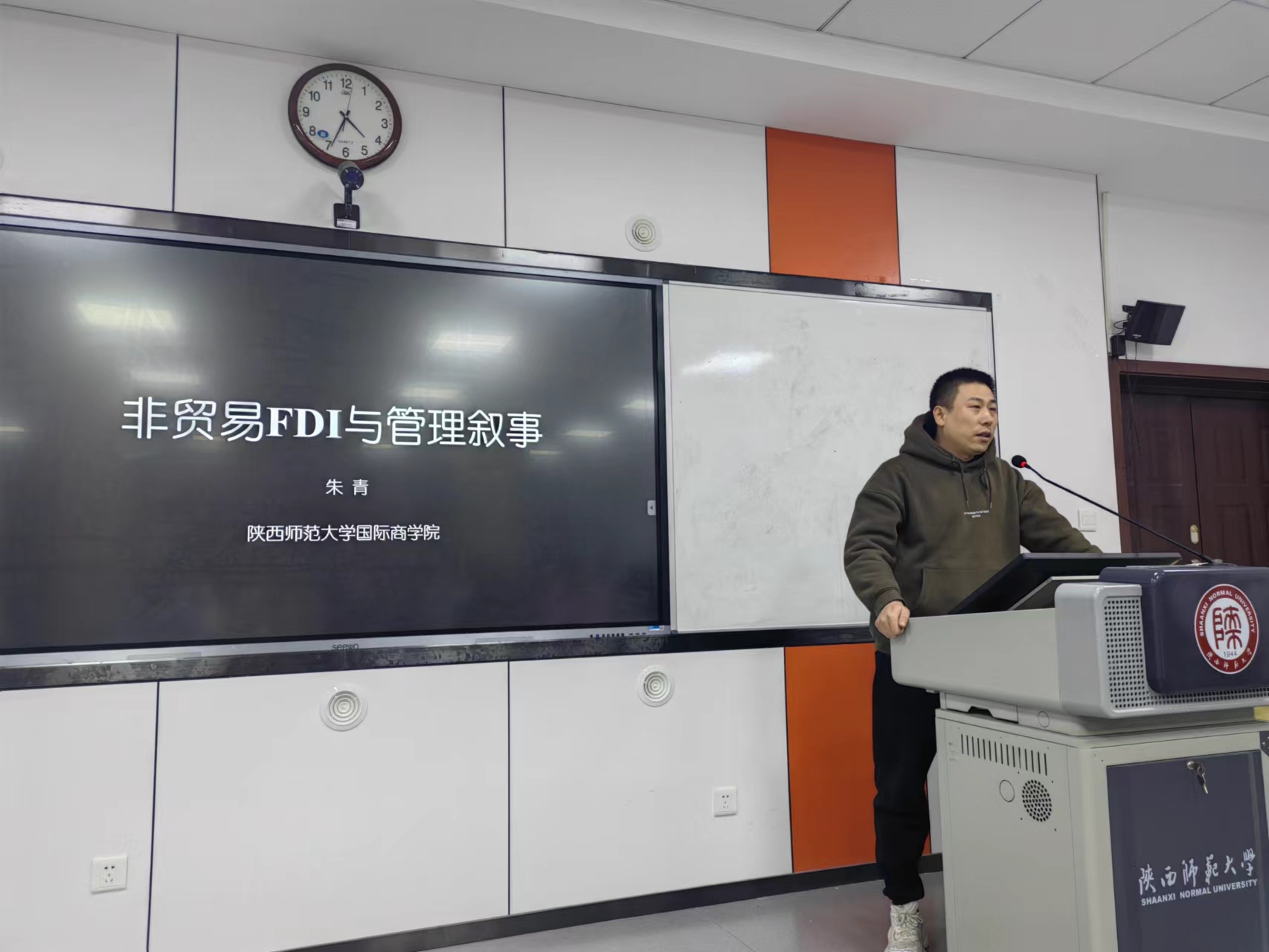讲座中,朱教授从非贸易FDI的定义、管理叙事的价值、发展中的中国FDI与ODI、中国管理叙事的国际化以及管理叙事在企业决策中的关键作用等四个方面讲述。通过大量详实经典的商业案例分析和实战经验分享,伴随着幽默诙谐又深度解析的风格,朱教授为同学们打开一扇通向国际贸易的大门。最后,朱教授留下了一个引发各位同学沉思的问题:作为语言工具的潜在受益者全体,我们将如何面对一个不用工资、不会疲惫的人工智能体?