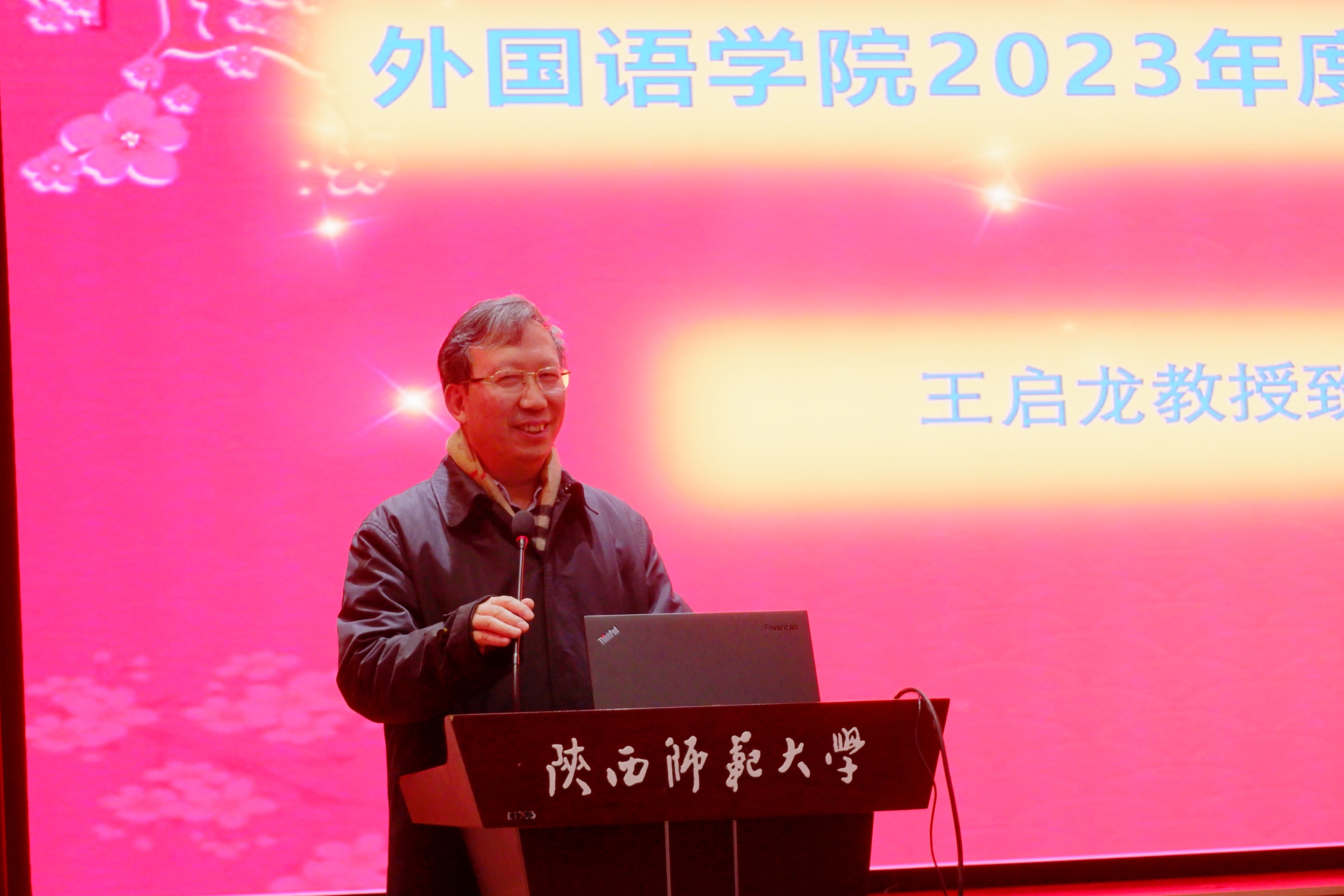 王启龙教授致辞。他向公司取得标志性成果、新入职的教师、新晋升的教授及副教授表示祝贺,并提出对全体教职员工的新期待。他强调,新的形势对教师和专业人才的要求不断提高,全体教职工要勇于承担责任,在新时代、新条件下做出新成绩。