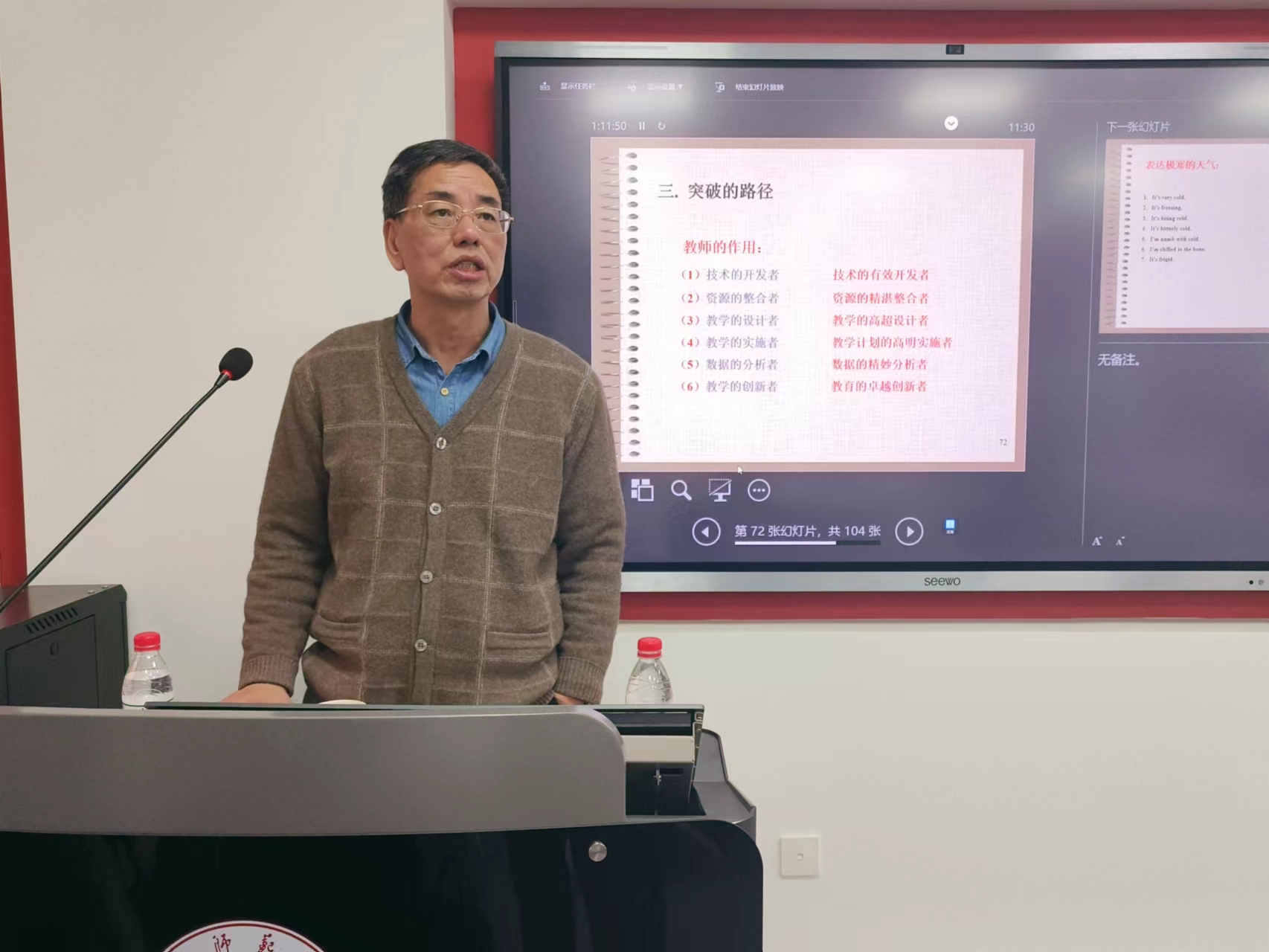 王教授认为,母语水平不足也会影响到外语水平,教师应该学贯中西,将汉语学习纳入课程体系,致力于中外语言学研究。同时,外语教师要注重外语教学方法的多样性,要直面人工智能对外语教育的冲击,融合多家理论为一体,于内部突破自我,做创新型工作,与人工智能合作。随后,王教授列举了各类句法、词汇、介词的使用、一语多义、组词造句、句型转换等具体的英文实例,从“经师”“能师”“人师”多角度呼吁在座教师要勤于思考,培养弹性思维。
