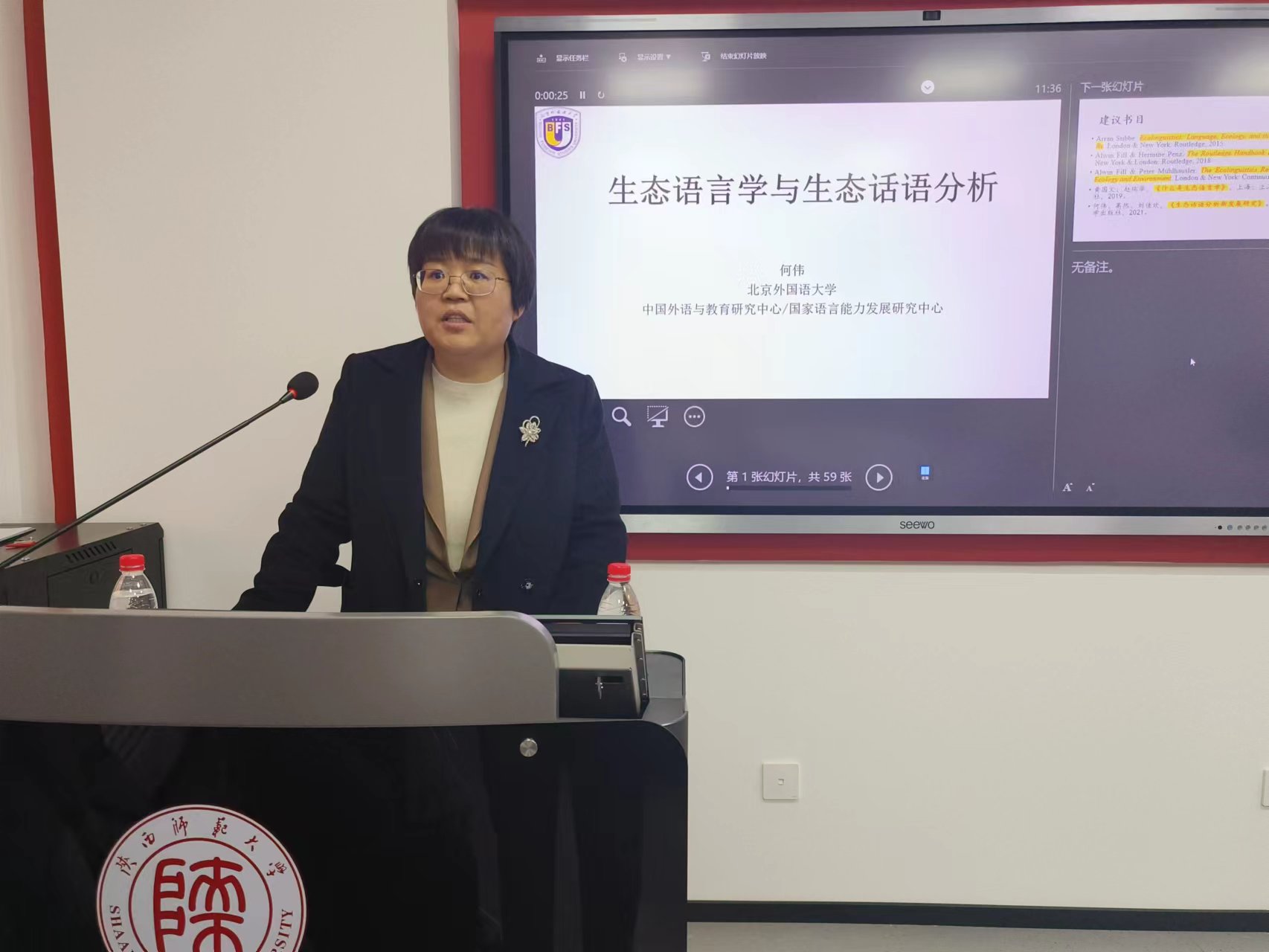 何伟教授就“生态语言学与生态话语分析”进行第二场讲座的发言。何伟教授首先总体介绍生态语言学的学科发展、关注度增长趋势、该话题的期刊引用量及相关参考书,并简要介绍生态语言学的发展历程。接着,何教授从“生态语言学与生态话语分析”“生态话语分析的指导思想:生态哲学观”“生态话语分析的理论手段”“生态话语分析理论的应用领域”“教材生态话语分析”五方面对生态语言学研究进行详细介绍。何教授呼吁教师在课堂中积极挖掘教材话语的生态意义,帮助员工在语言学习中树立积极的生态价值观;呼吁员工增强生态意识,并在教材学习中熟练掌握相关生态话语模式,为后续创作此类话语打下良好的基础。