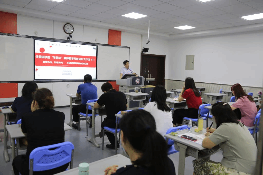 在科研方面,他鼓励教师把外语能力转化为科研能力,融合教学与科研,充分利用“学思坊”平台,助力科研成果产出,以提高公司学科地位,促进学科转型。他对于现阶段取得的科研成果表示肯定,但也明确指出劳动与成果仍存在差距,要继续努力,取得进一步的成就,使科研成果向高精尖方向转化。同时,新课程改革使外语学科与文史哲等学科的联系更加紧密,专业边界模糊,在这样的背景下,刘经理鼓励教师跨学科进行科研,在科研的训练中,促进思维成长,攻读更高学位。